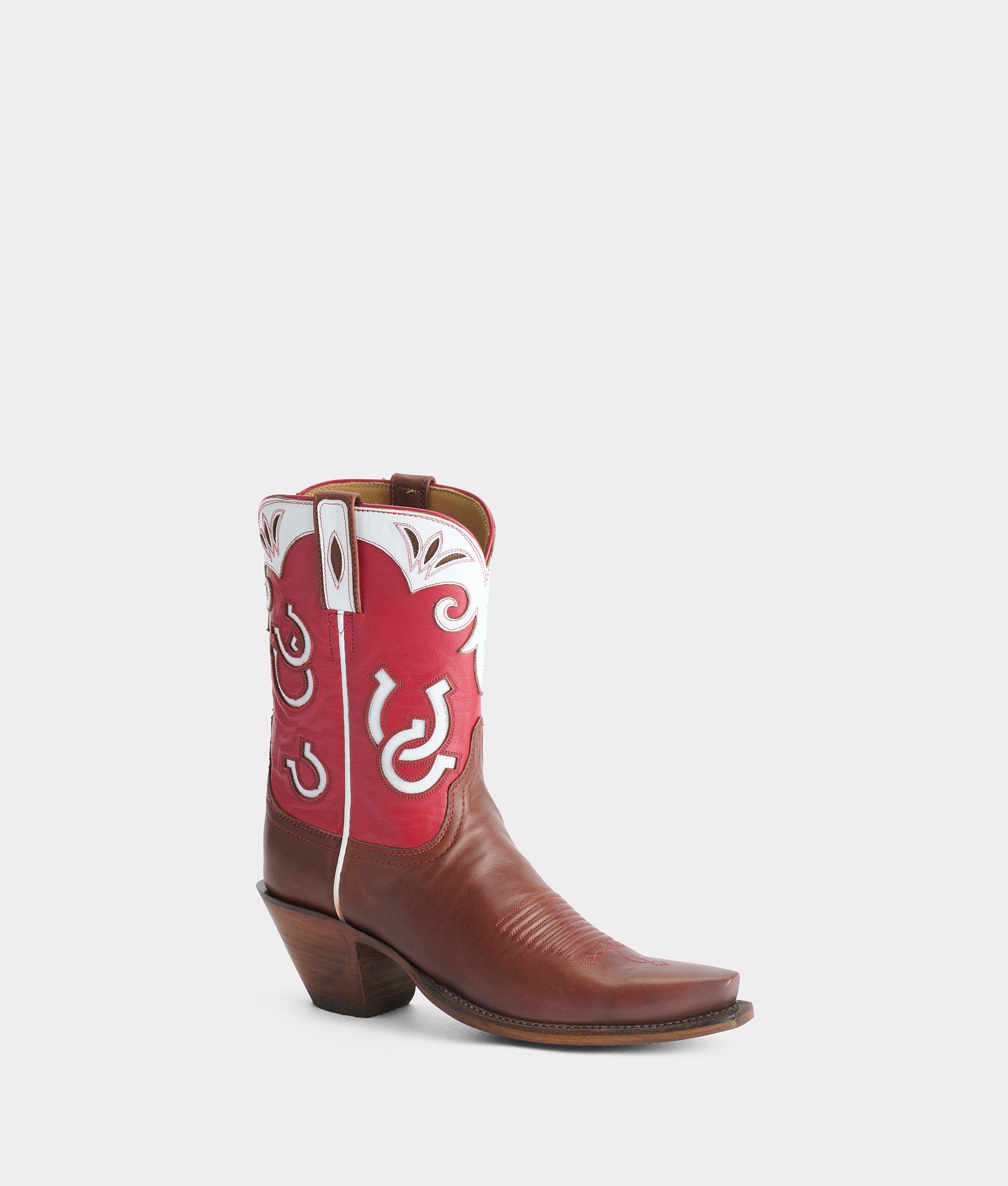 Inspired by eighth century folklore. the horseshoe is a symbol of luck and good fortune. Lucchese’s Beginner’s Luck takes poker table confidence to a new level. Red and black doesn’t just come in hearts and diamonds. but in size seven and eights ?C you’ll stay winning. A smoke-filled room is no match for the Lucky Shoe inlay. collar. and pull strap designs ?C these 9-inch-tall cow/goat quarters see right through the bull of a gamblin’ man. Our Lucchese artisans select and cut these rich bovine leathers by hand so you could hold the winning one. Whether you’re just starting out or maybe you’ve seen a thing or two – everyone needs a little luck. Handmade in Texas.