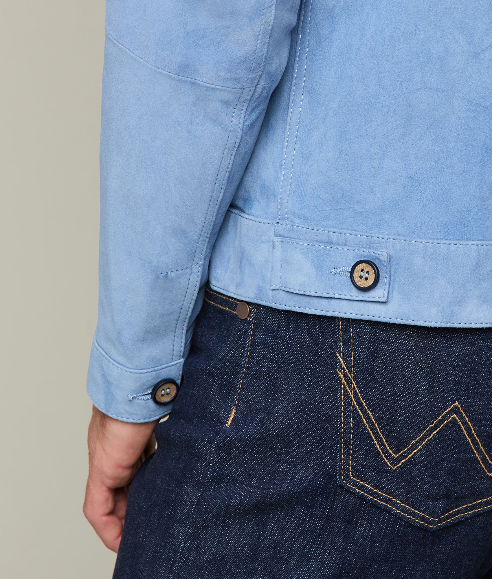 The Big Sky Jacket is a nod to the open skies of the West. Made from the most supple Goat Suede in muted tones of blue. this piece exudes modern flair with a touch of classic Americana. Whether worn over a plaid shirt for a casual outing or layered with knitwear for a crisp morning. this jacket promises to elevate any wardrobe with its understated elegance.