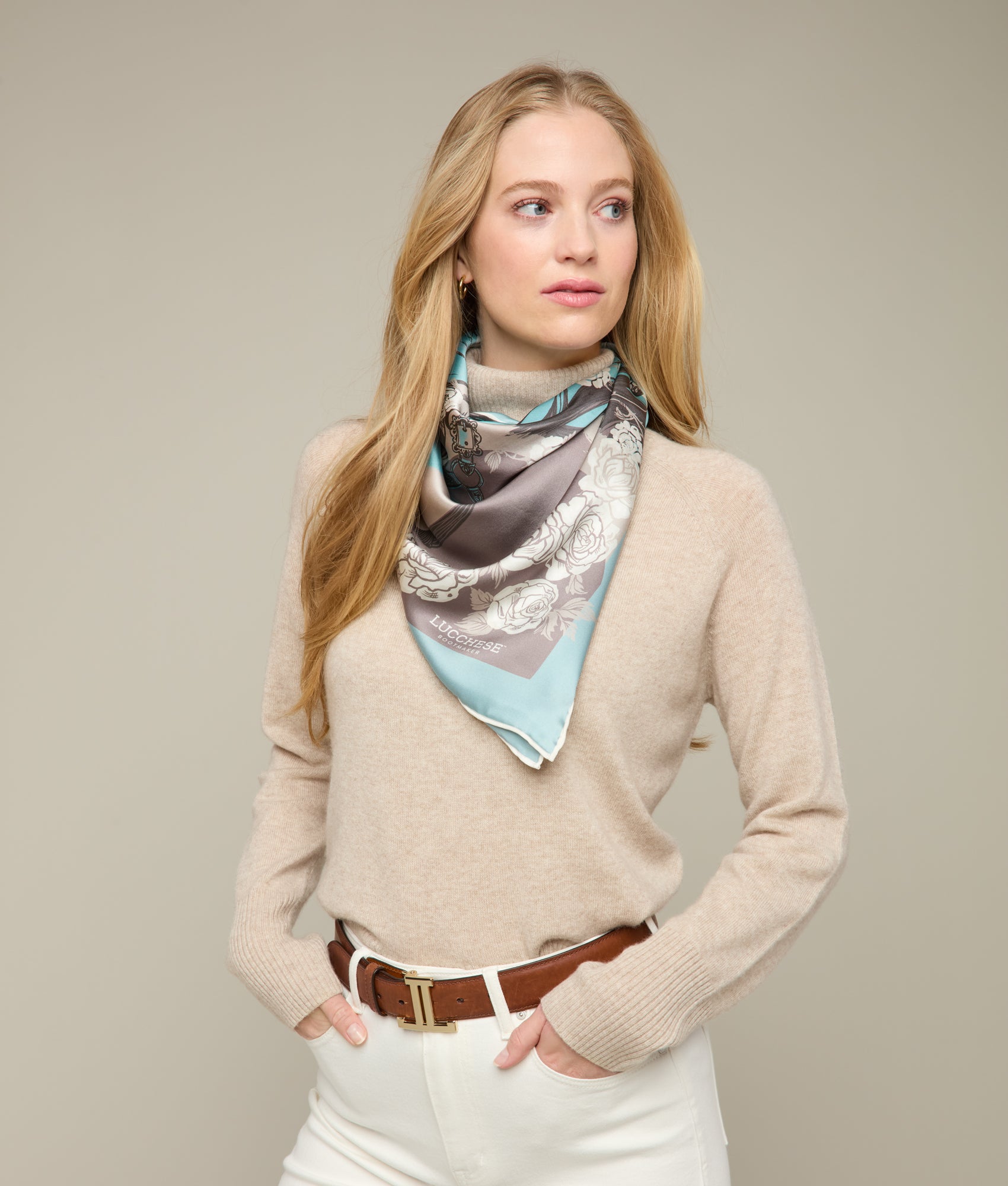 Bloom with beauty. Rooted in our equestrian and cavalry heritage. the Cavalry Rose Scarf offers not only the highest quality silk. but endless fashion-forward getups for the regal bearing men and women. The scarf explores fully-blossomed roses on a tree entangled with a serpent. Rendered to perfection. the reds and oranges add dramatic flair to any ensemble. Get creative – around your neck. ribboned on a bag. or hanging on a wall. the Cavalry Rose Scarf is meant to be seen.?