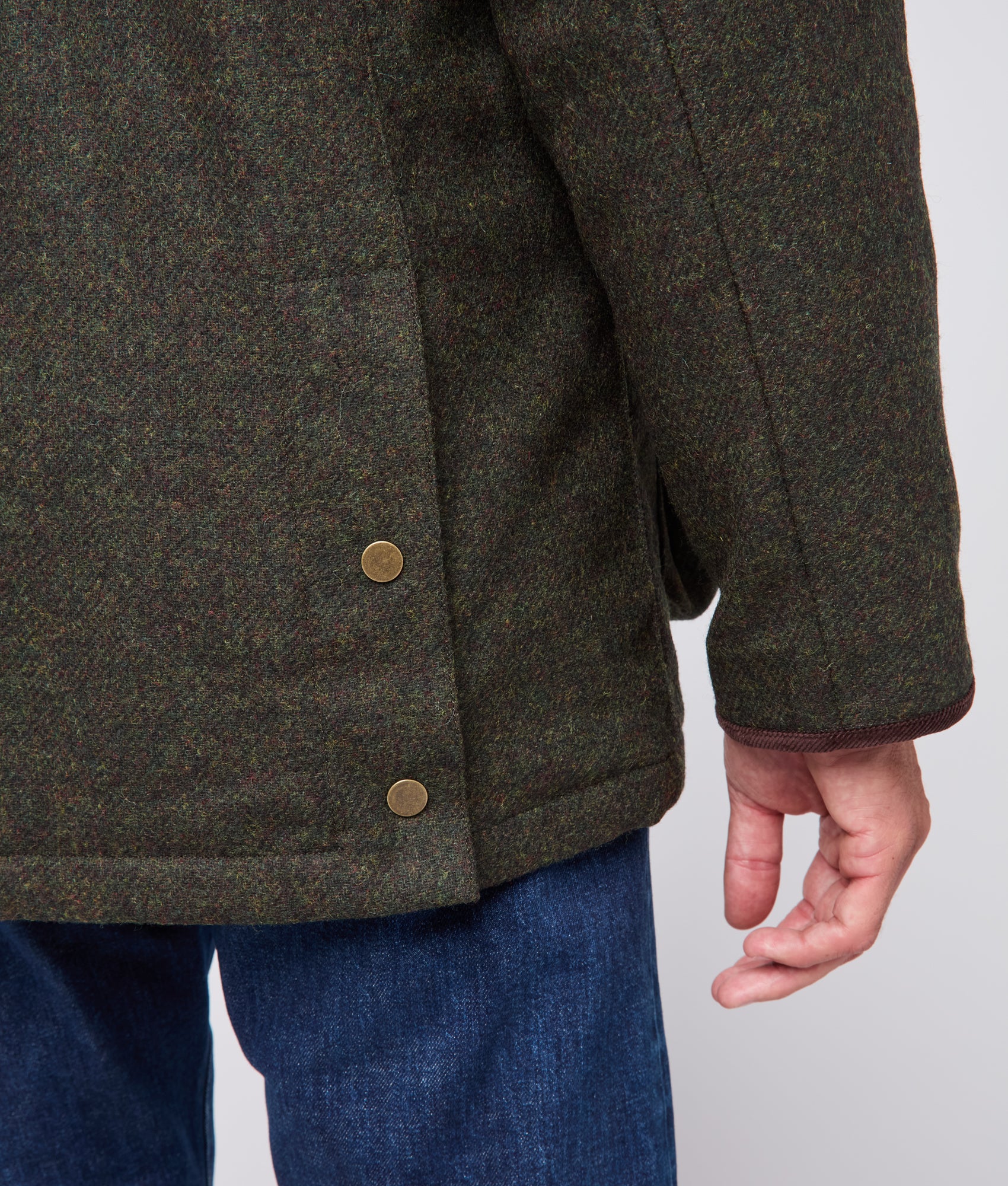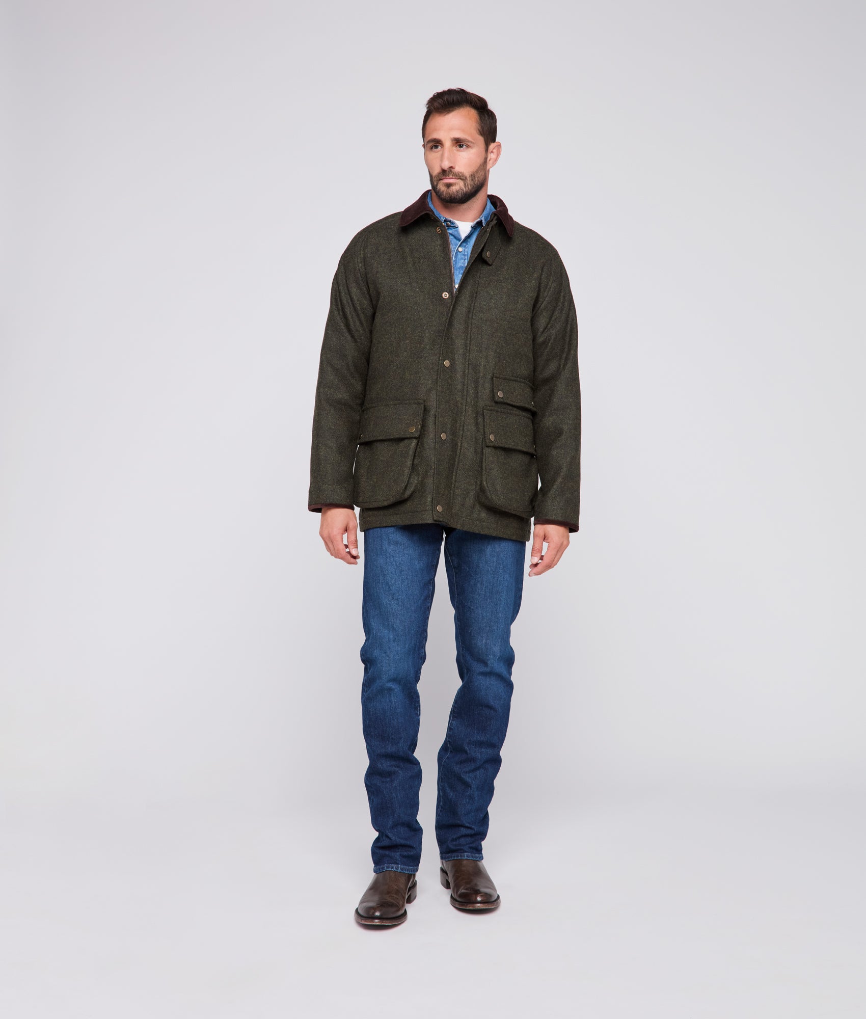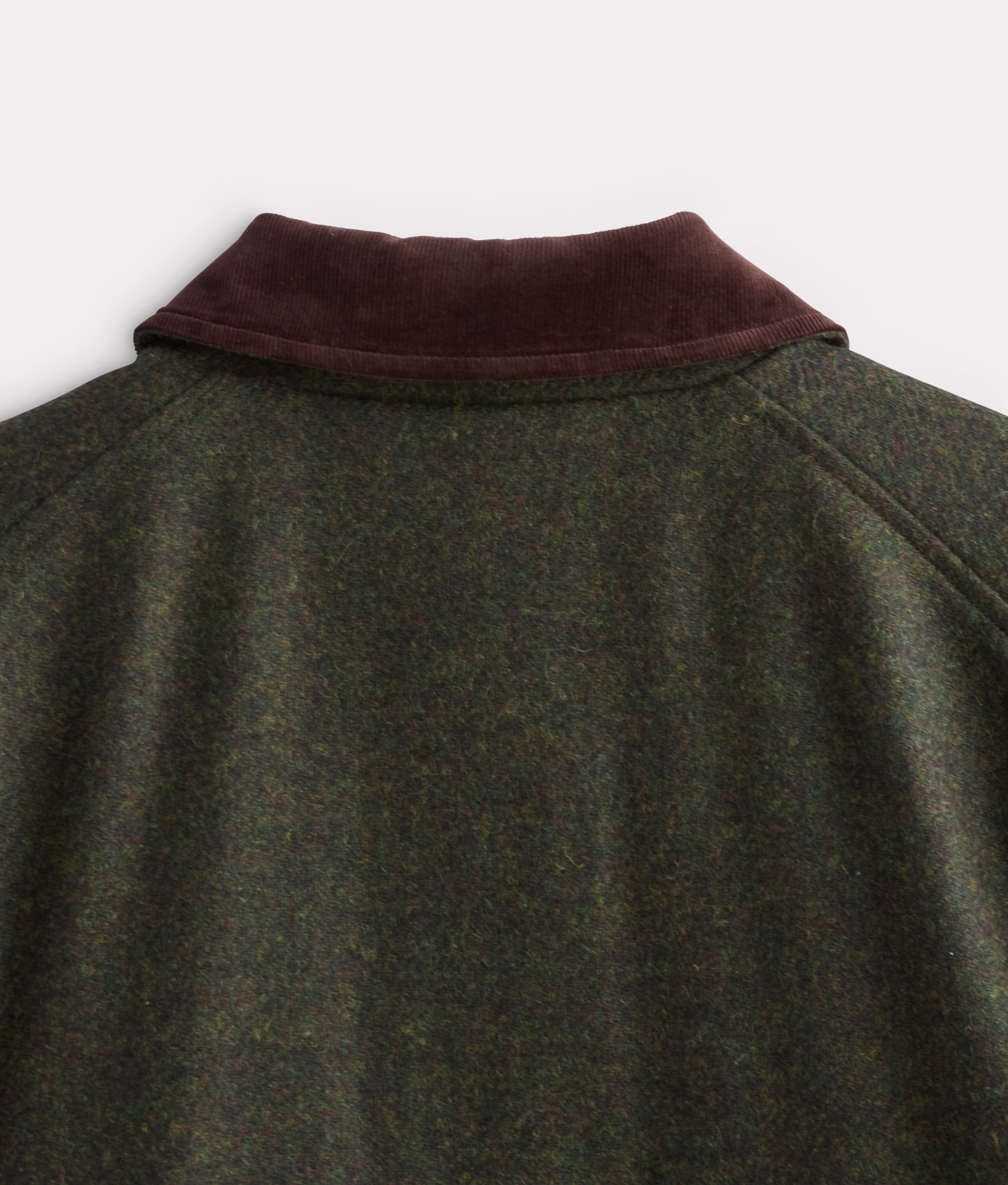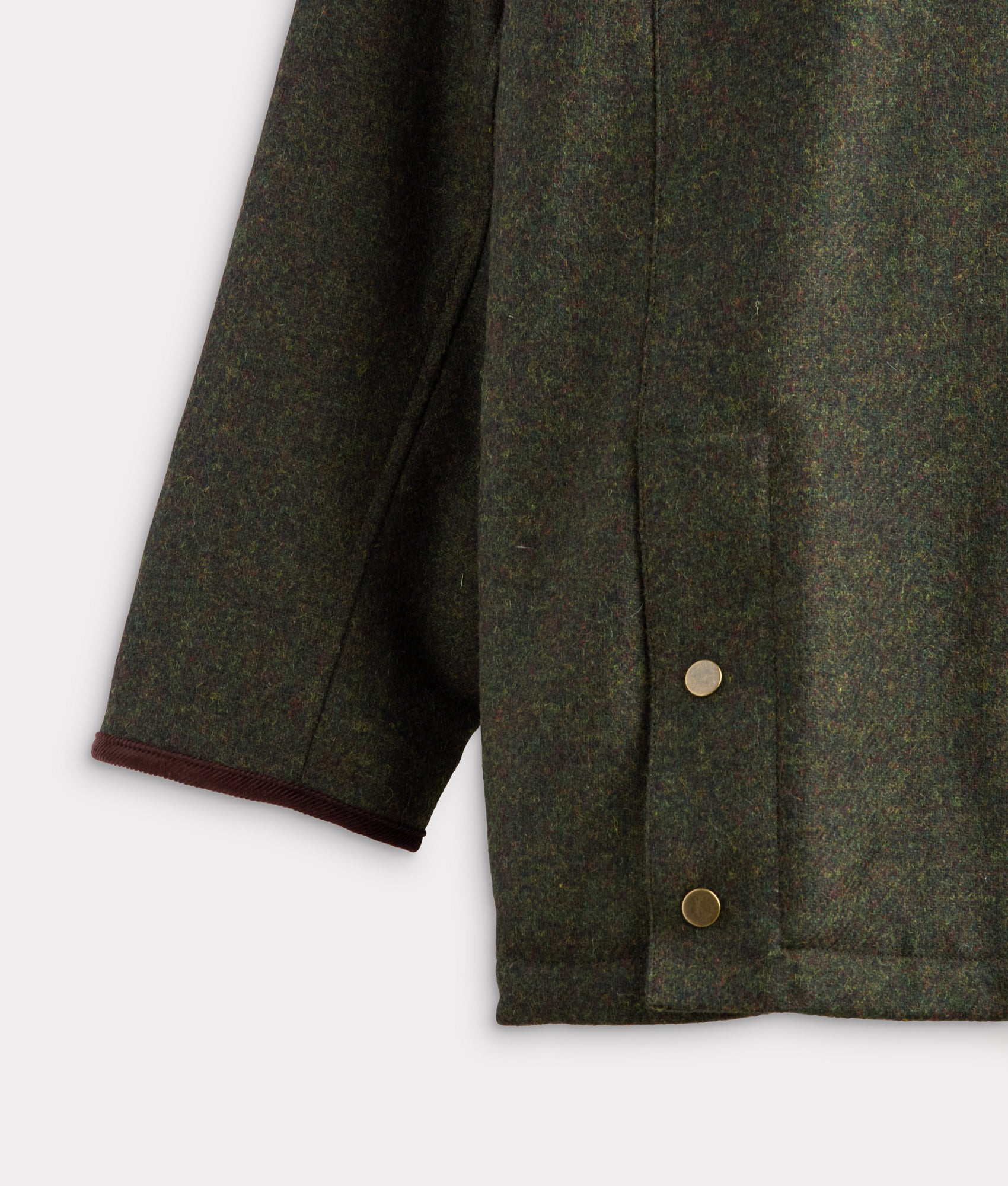 This structured. military-inspired wool jacket in a deep forest green hue features a smart. utilitarian design. Made from 100% virgin Shetland wool. this Italian-crafted jacket brings heritage craftsmanship to a contemporary outerwear staple. The rich wool texture offers natural insulation. while the clean design keeps it versatile for urban or outdoor settings. Made in Italy.