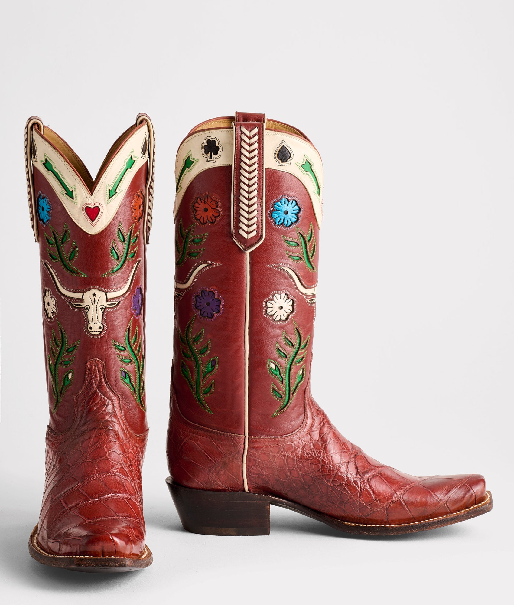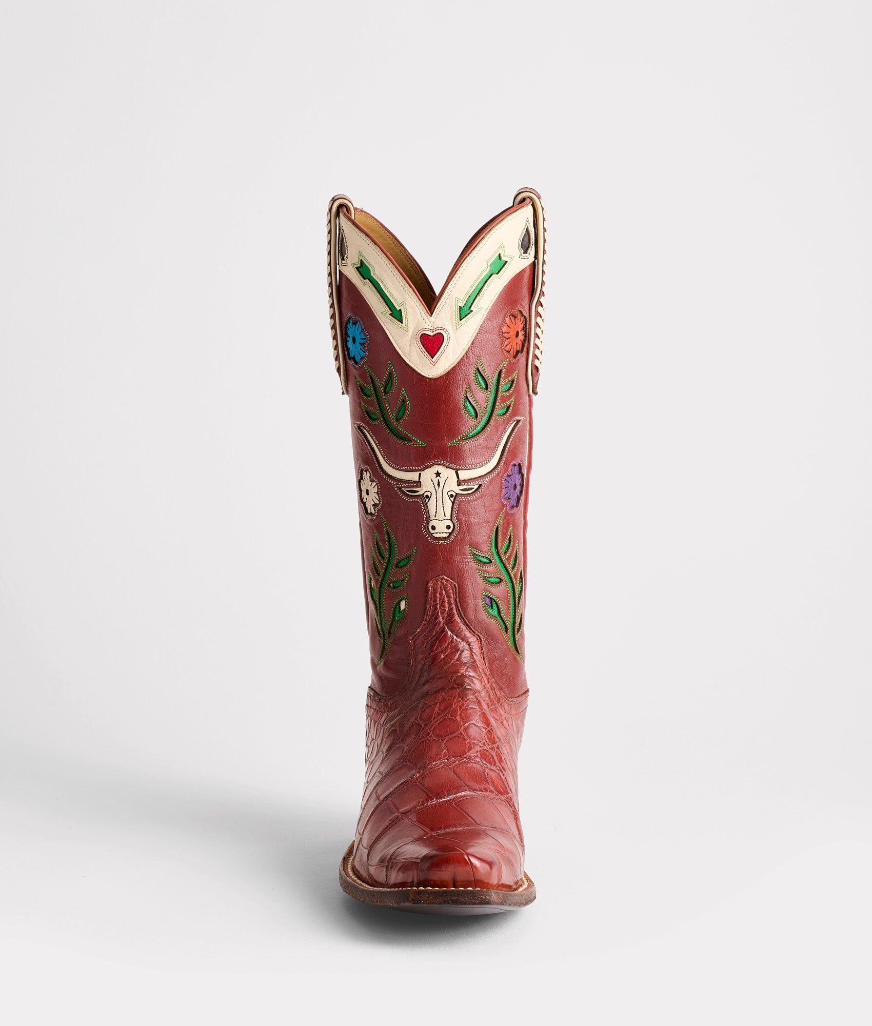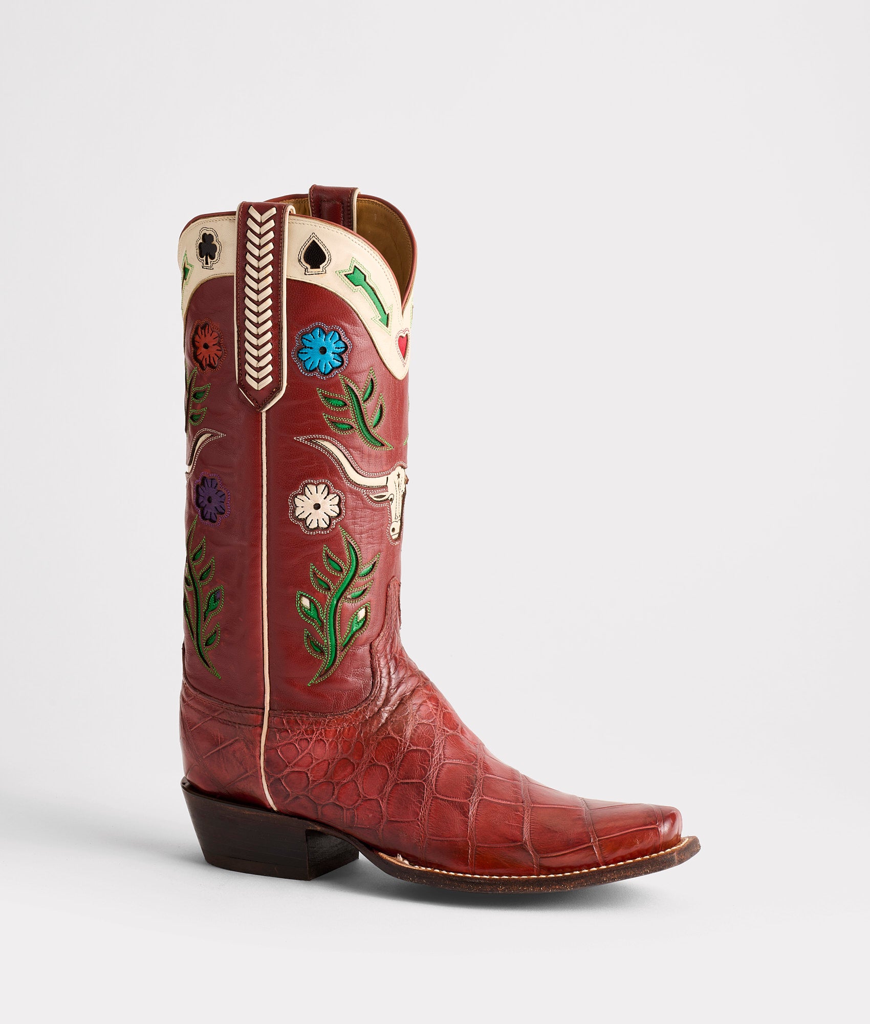 An heirloom. An ode. A statement told through craftsmanship. The Hat Tipper honors tradition with every cut and stitch. Its silhouette is a canvas for the time-tested artistry of our El Paso bootmakers. From collar to quarter. the Gallardo motifs tell the story of the West. saturated in rich color and layered with depth and texture. The 16-row. hand-laced Goat pull straps draw the eye down the crème side seam to the vamp. where every cut of Wild-Caught American Alligator reflects the respect our artisans show the process—hand-selected. hand-matched. and crafted with care. Respect begins with the work. not the words—Hat Tipper says more than the man will ever have to. Handmade in Texas.
