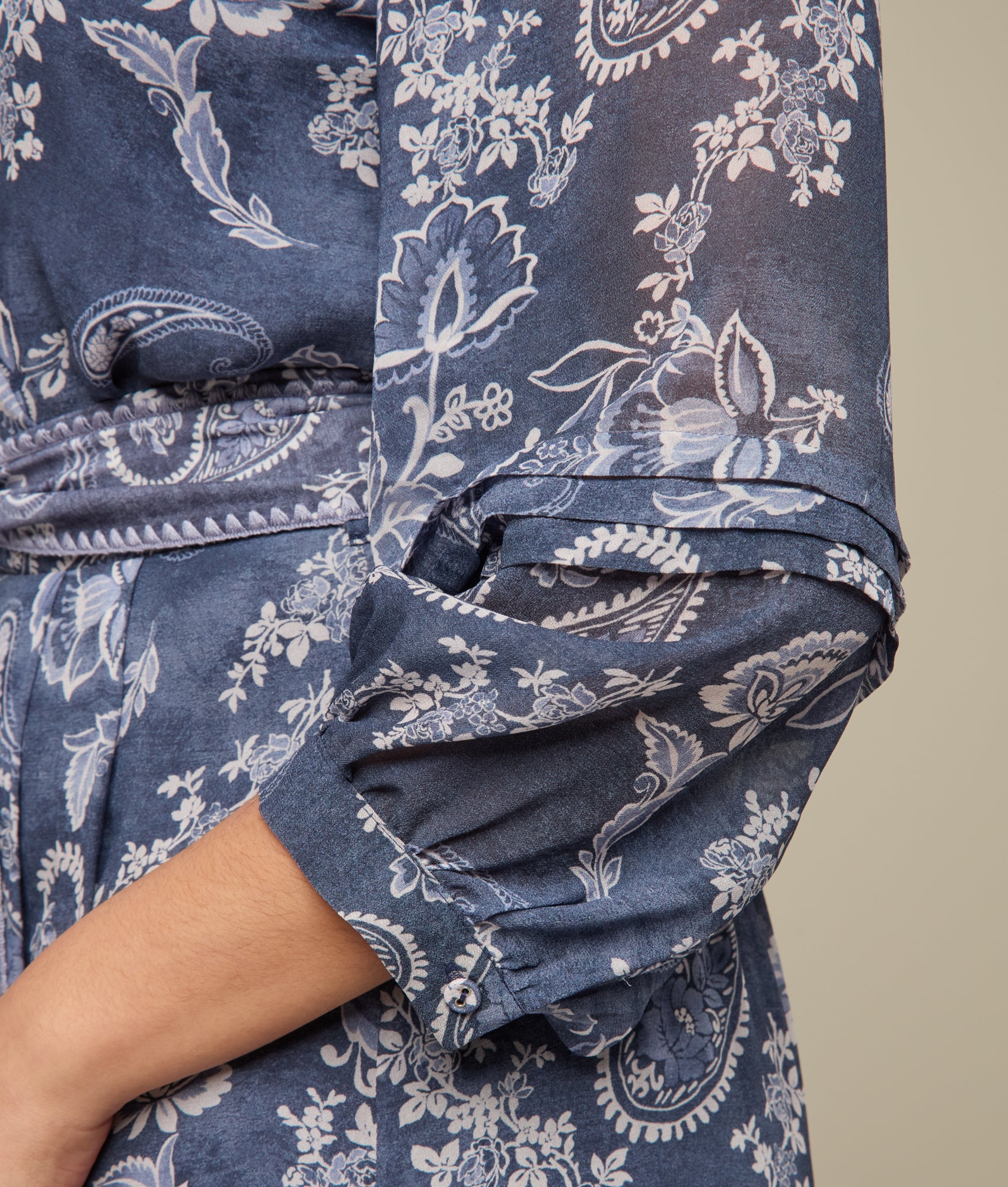This Iris Dress features a captivating blue floral and paisley design. Its intricate patterns blend soft. romantic florals with swirling paisley motifs that evoke a sense of bohemian elegance. The lantern sleeves add a dramatic touch. creating an ethereal. flowing silhouette that moves with grace. The dress is a celebration of texture and movement. its fabric catching the light in a way that enhances the vibrancy of the design.