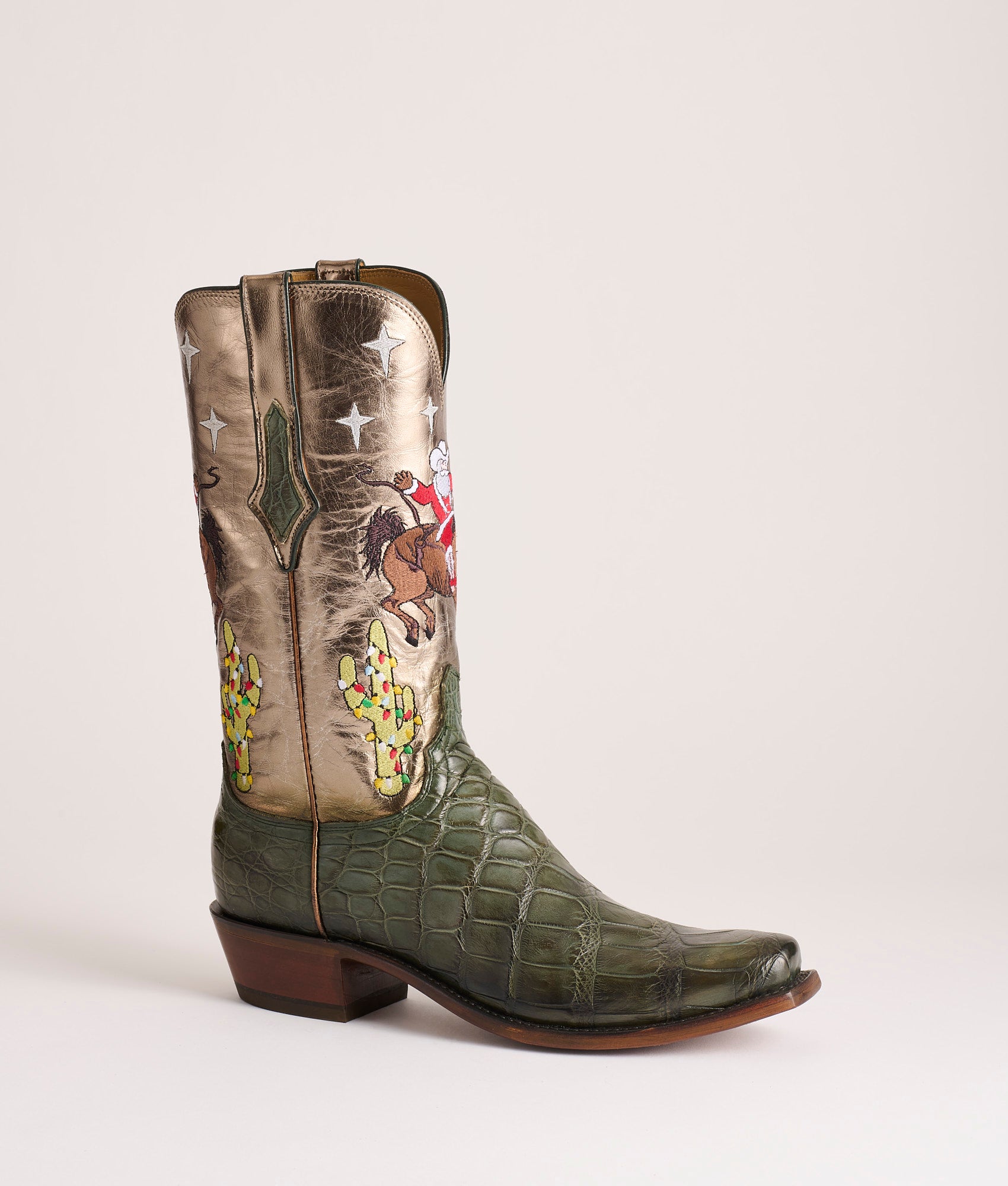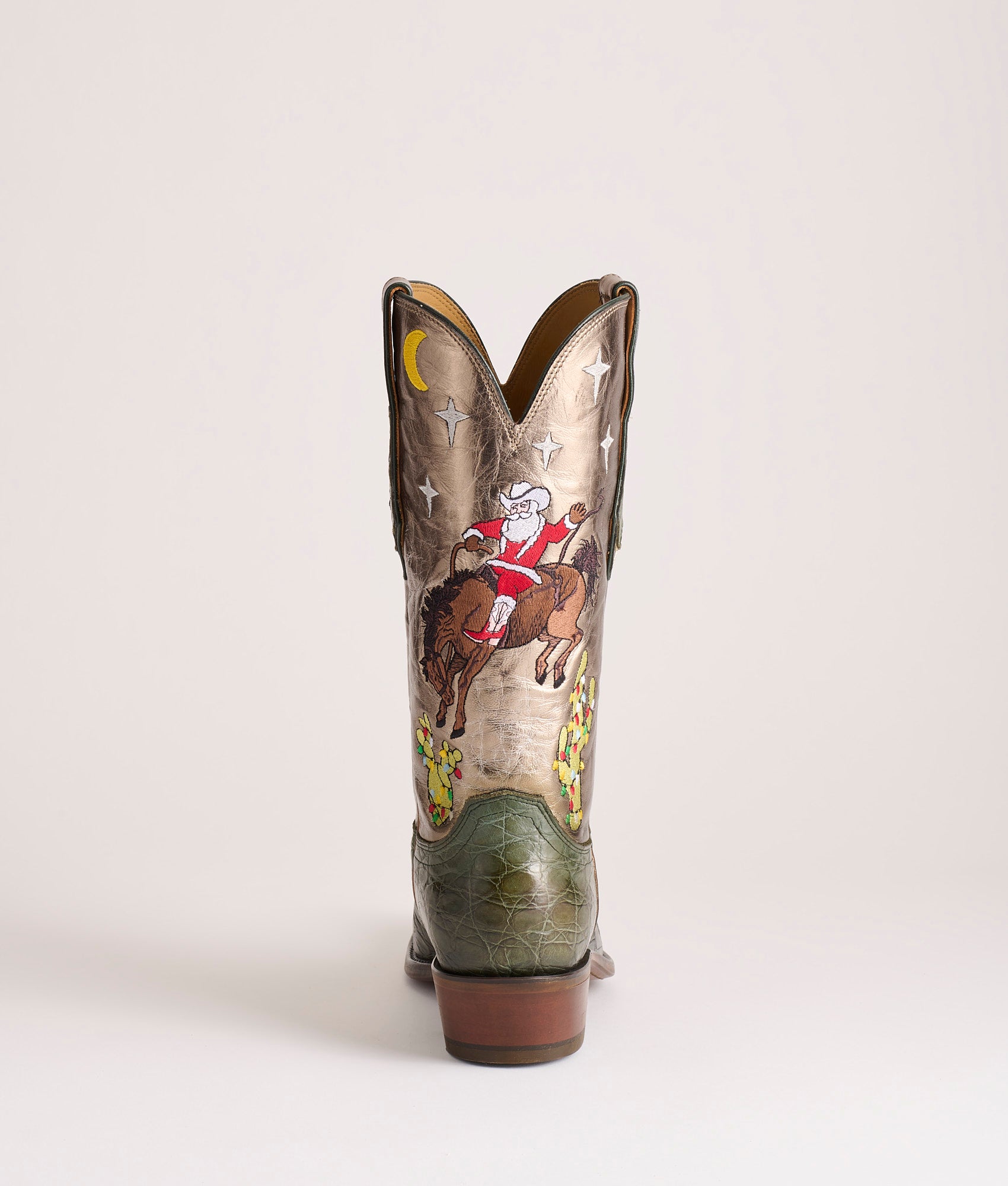 Jingle is the first edition in Lucchese’s Christmas Annual. a limited series of festive holiday boots. Hand-stained Giant Gator in a deep evergreen hue that gives the boot that heirloom feel the moment you pull it on. The vamps have been expertly finished by master Lucchese artisans. using wax and heat to reveal the high-low color of the hand-stained Giant Gator. which brings out the leather’s unique character and depth. A metallic-foiled bronze Goat shaft catches the glow of firelight. embroidered with a scene that’s only a child at heart would dream up: Santa himself spurring a bronc beneath a star-flecked sky. with Christmas cactus lighting the way. Laser-engraved: Lucchese Christmas First Edition 2025. Handmade in Texas.