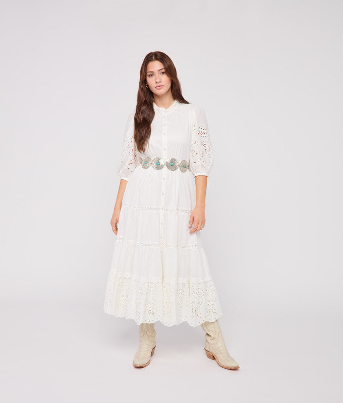 The King Concho Belt is an heirloom piece. It is hand-forged sterling silver shaped by artisans into a row of scalloped medallions. each etched with deliberate strokes and finished in a muted matte that lends visual texture and depth. At the center of every concho sits a mined Kingman turquoise stone. its desert-blue depth anchoring the belt in the southwestern landscape. Measuring 38 inches with an added 5-inch chain for adjustability. each 3 x 2.7 piece is a statement in proportion and precision.