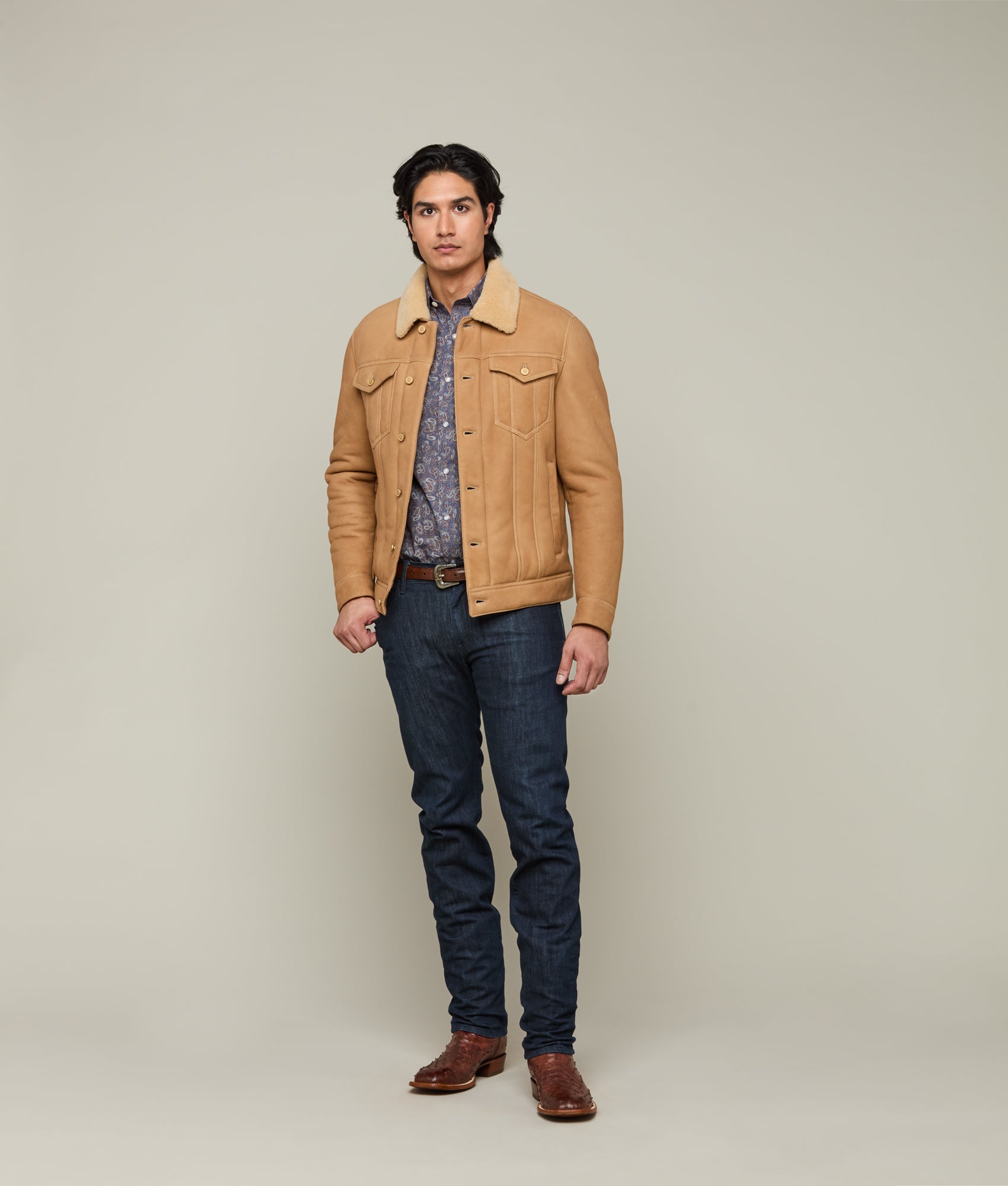 Crafted with meticulous attention to detail. the Shearling Trucker Jacket epitomizes sophisticated elegance. Its robust silhouette boasts a dual chest pocket arrangement. offering both functionality and style. Frontal buttons seamlessly integrate into the jacket’s design. complementing the structured shearling collar that defines the neckline. This rustic piece is a necessity during the colder months.