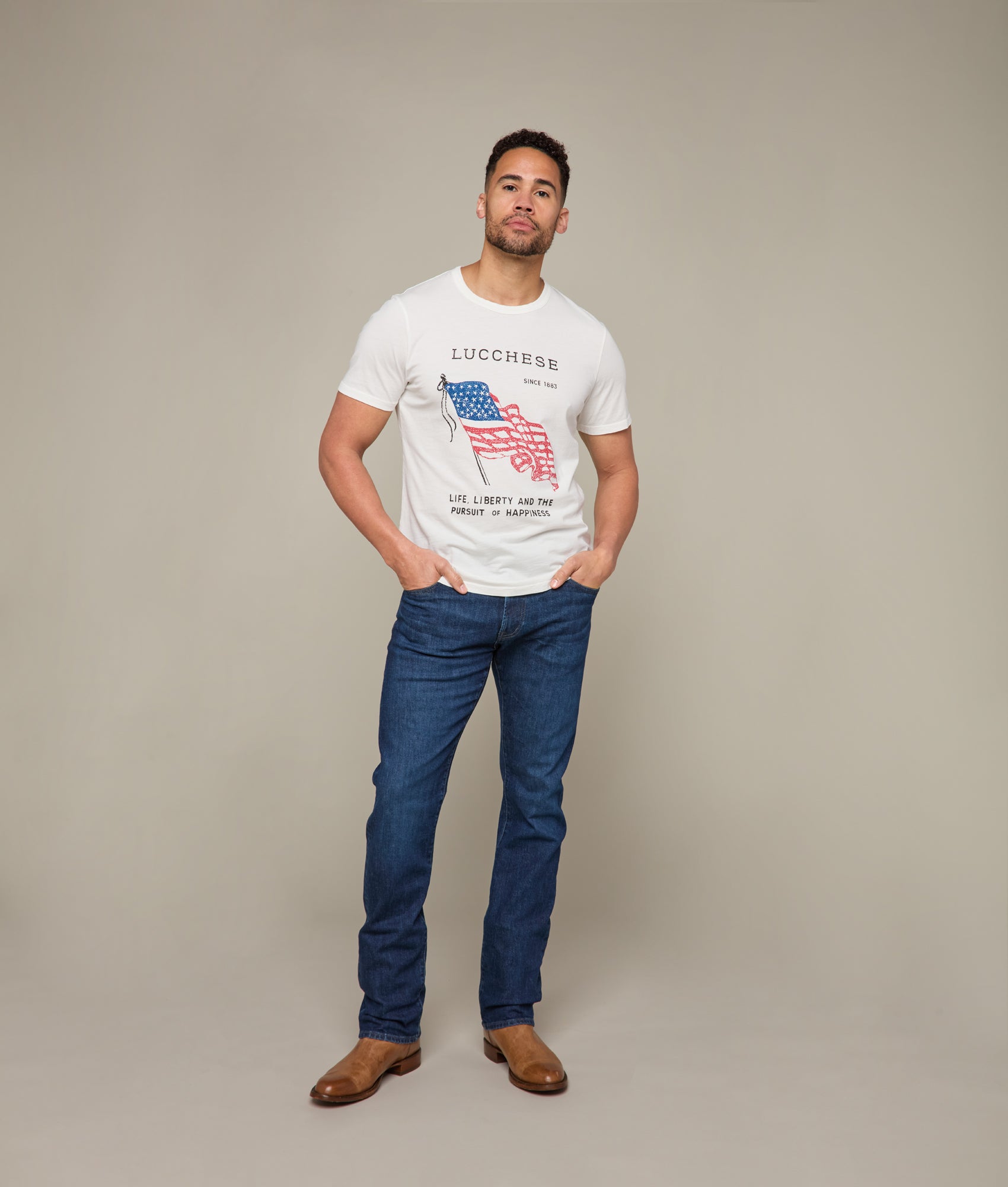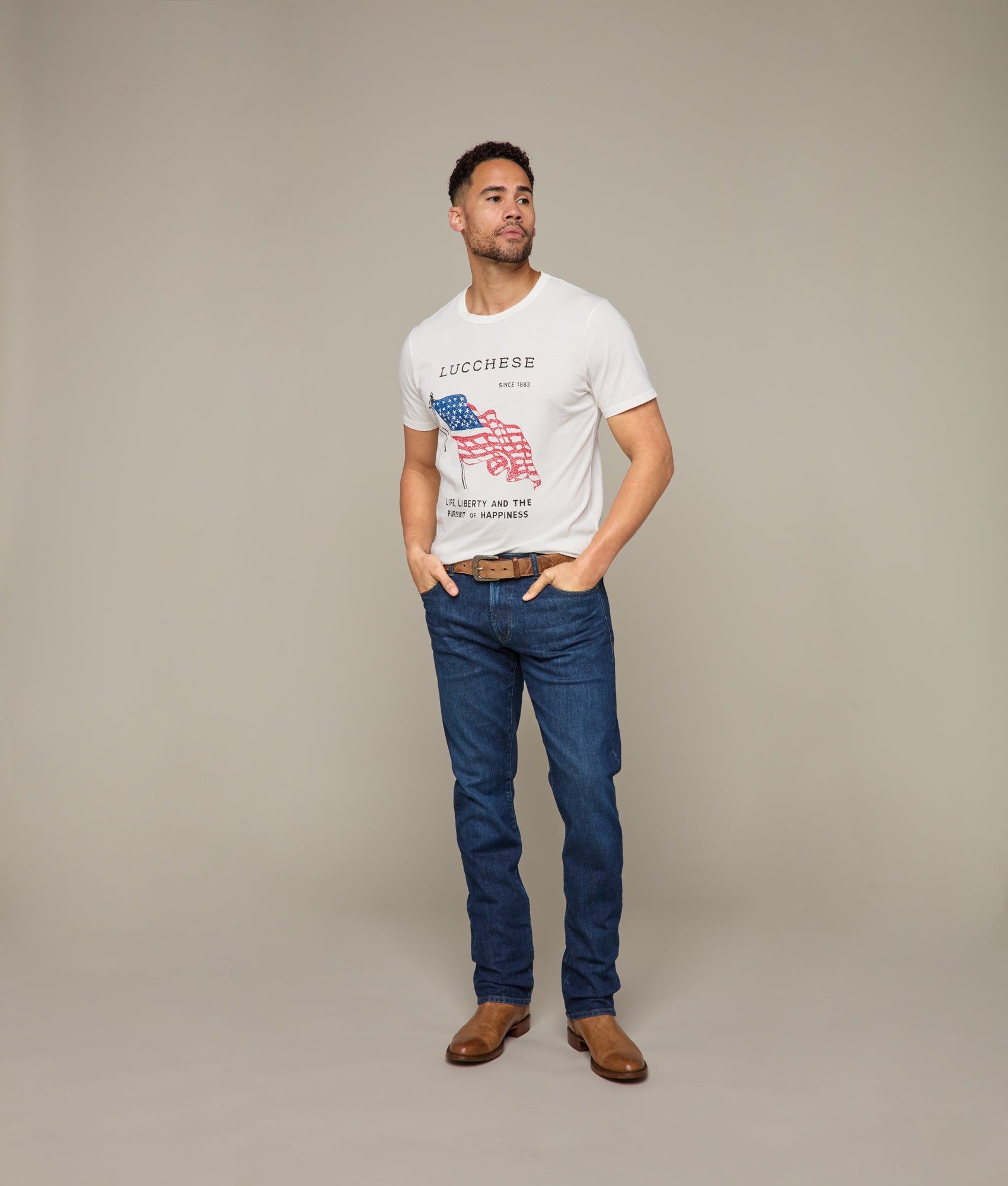 The design captures the essence of liberty in motion??a granulated American flag caught in the wind. yet full of life. Lucchese has a deep historical connection to American craftsmanship. much like the flag.