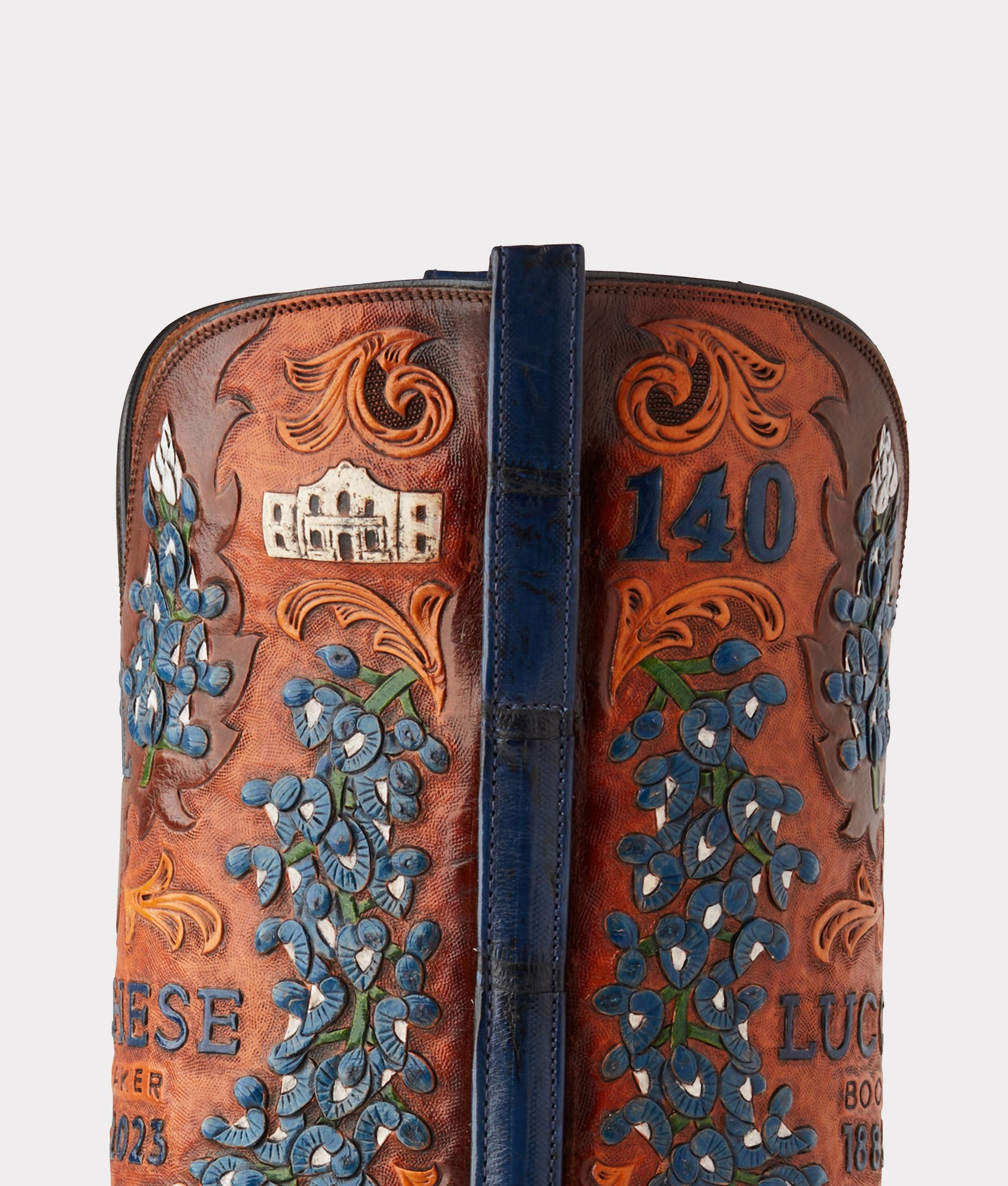 The Bluebonnet is a celebration for 140 years of Lucchese bootmaking – a timeless heirloom built on craftsmanship. dedication. tradition. and the West. Fashioned from the finest hand-stained Giant Alligator leather. this masterpiece is fully hand-tooled and hand-painted by the world’s best artisans. A Bluebonnet bouquet covers the entirety of this one-of-a-kind silhouette. unifying each element through color and dimension. Named after the Texas state flower and adorned with the historical landmark the Alamo. Lucchese Bootmaker is proud to announce the limited-edition Bluebonnet – 140 years of history told through a single boot. The Bluebonnet comes with a matching custom boot bag. perfect for travel and stowing away for later use or decorations. Born in Italy. Bred in Texas. Handmade in Texas.
