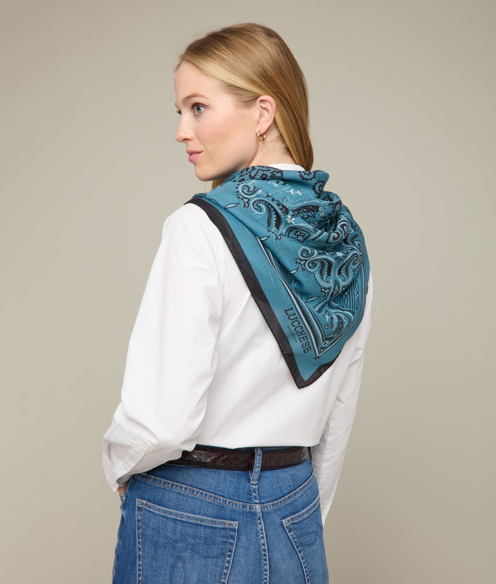 Based on our iconic Mirrored-L logo. this piece showcases subtle nods of Lucchese. Adorned with intricate. hand-drawn patterns inspired by classic western motifs. each design is a work of art. reflecting the spirit and heritage of the American West. The rich colors are carefully chosen to complement any outfit. adding a touch of opulence and style whether worn around the neck. as a headscarf. or tied to a handbag.