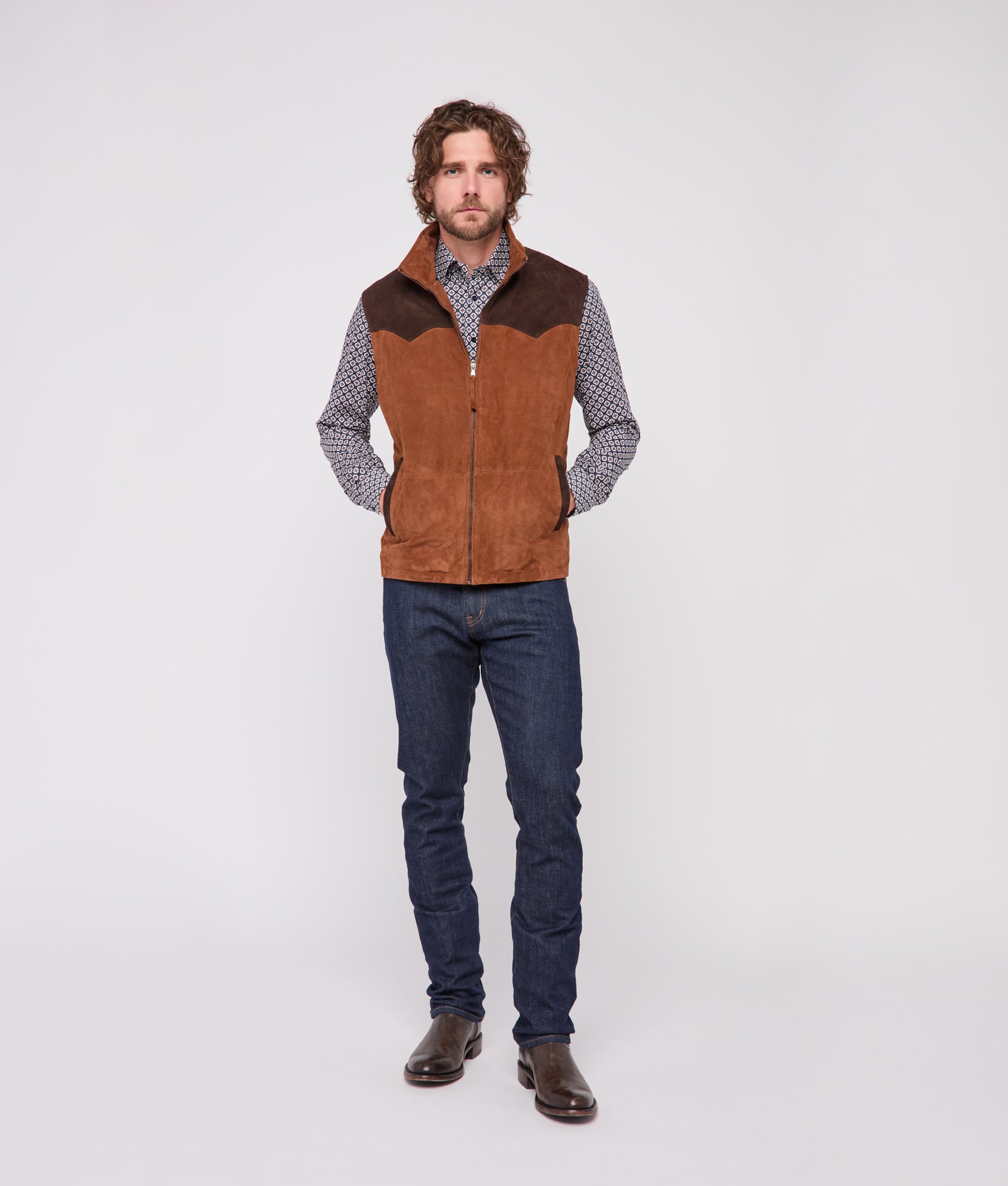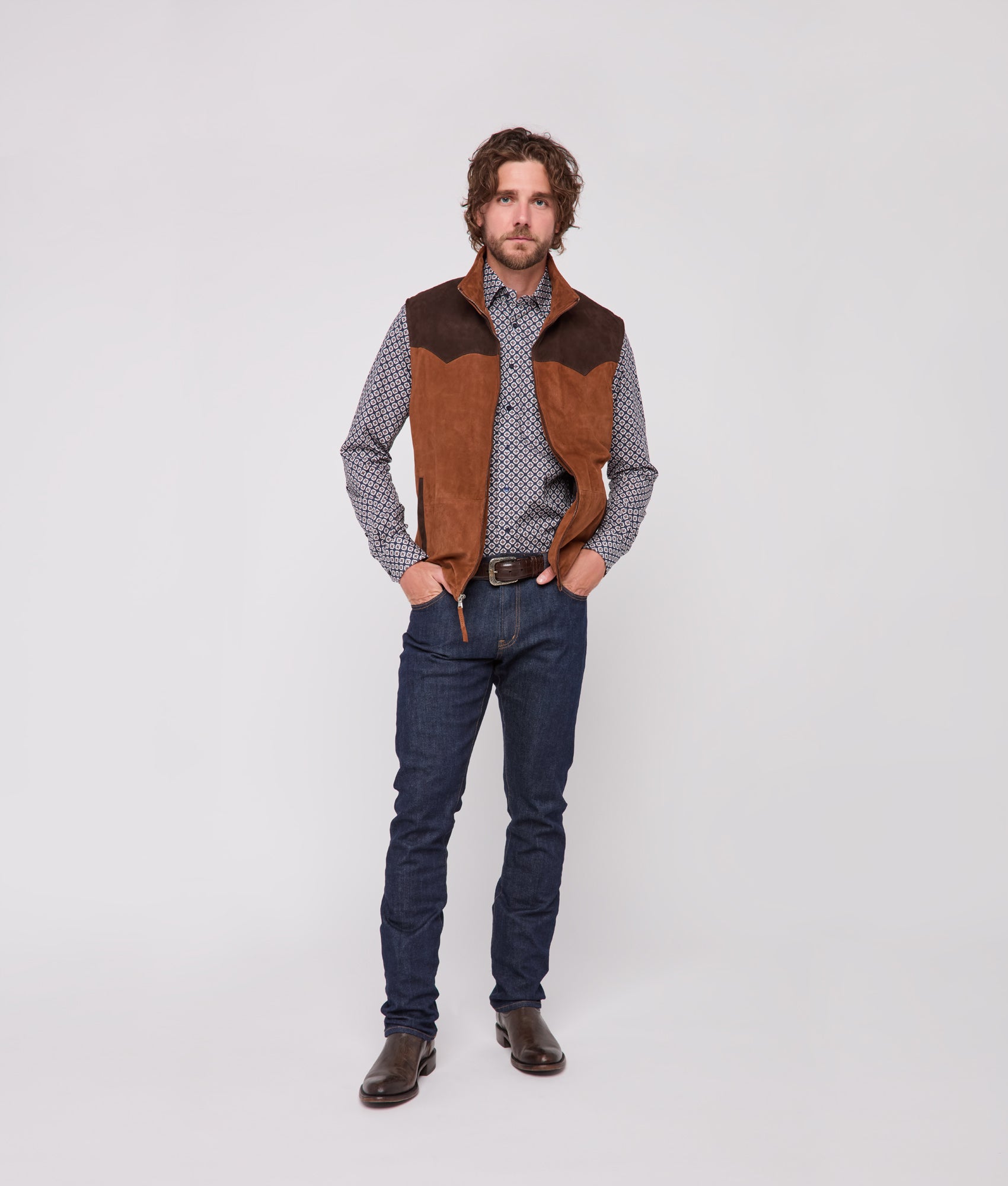 The Rit Two-Tone Vest is a tribute to the untamed West. crafted from rich. genuine leather in shades of deep brown and wild green that echo the desert’s raw beauty. With its striking Western yoke and functional side pockets. it blends bold style with rugged practicality. designed to withstand any journey.