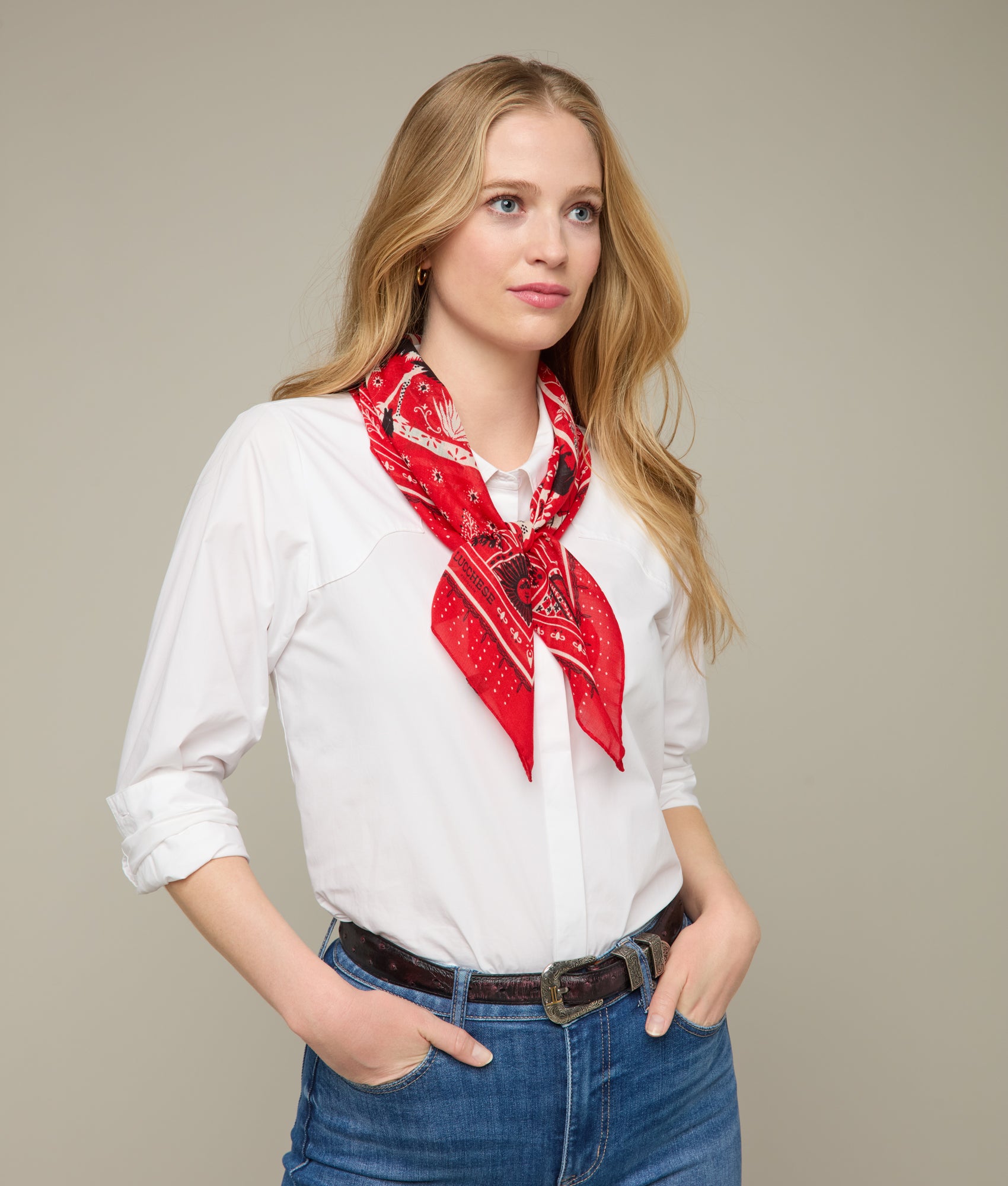 The Roots Silk Scarf is a timeless tribute to the rich heritage and deep-rooted history of the American West and Lucchese. Featuring intricate motifs that celebrate the spirit of the frontier. the scarf weaves together iconic symbols of the past. These elements are artfully intertwined in the delicate branches of a tree. evoking the interconnectedness of nature and tradition. Each detail on this scarf tells a story. offering a glimpse into the rugged beauty and enduring legacy of the West. while embracing the artistry and craftsmanship Lucchese is known for. The Roots Silk Scarf is not just an accessory. but a wearable piece of history. capturing the essence of time-honored Western culture.