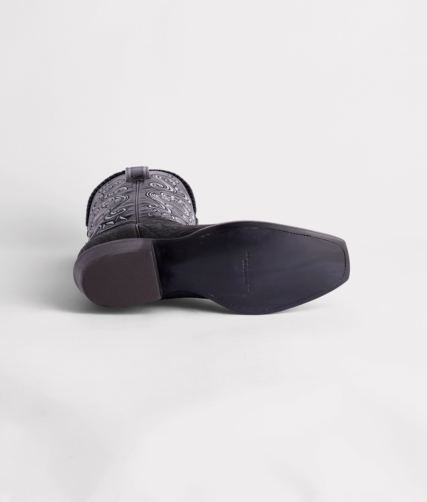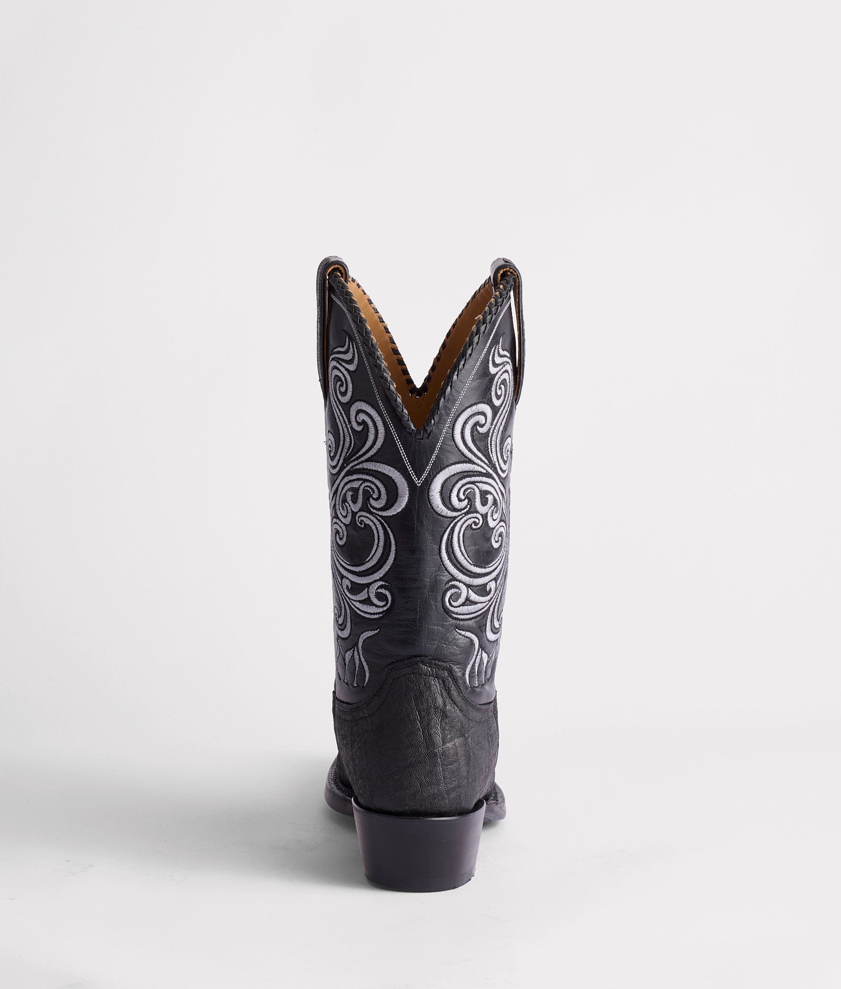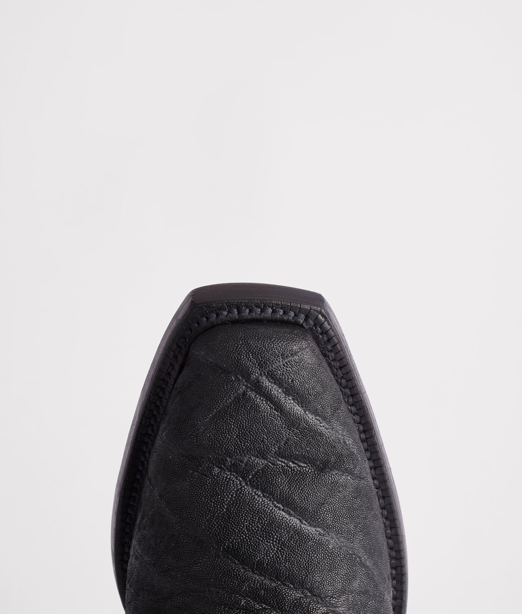 Crafted from rugged Elephant hide. this Western silhouette inherited its name from the mining town in Southwest Texas along the bluffs of the Rio Grande Valley. Terlingua. Untamed and wildly beautiful. the Terlingua takes the Muerte stitch pattern and cleverly reinterprets it as a skull. Midsoles are added to the boots to offer more stability and durability. affording their owner an extended lifetime of wear. Enriched by a whipstitch scallop detail. Terlingua is a touch of elegance to an otherwise daring look. Handmade in Texas.