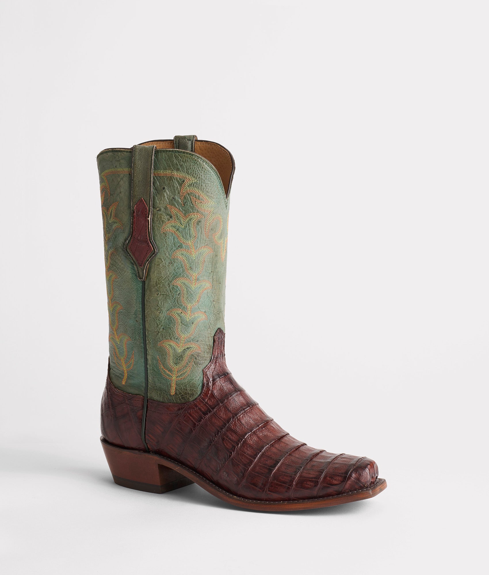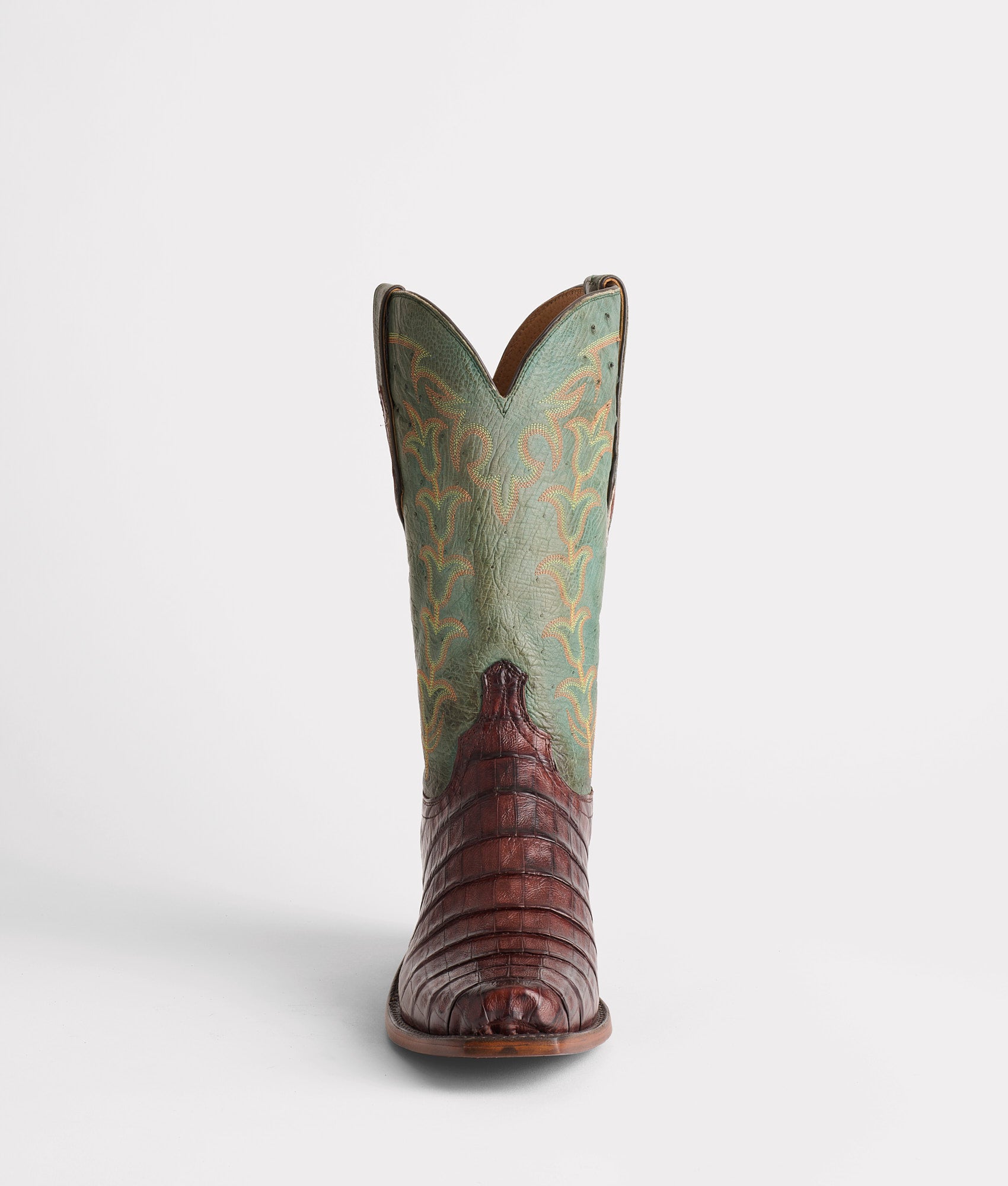 The man wearing?Tulipano?carries himself with quiet confidence. a presence that speaks before he ever says a word. He’s a man of contrasts ?C rugged yet refined. bold yet composed. Every detail of his style is intentional. and a reflection of his character. Hand-stained?Caiman in natural?brown?toneson?the?vamp?and?a?pop?of?color?on?the?Smooth?Ostrich quarters.?Why dirty a vase when you can freshen up a suit? Plus. leather smells better than tulips anyway! Handmade in Texas.