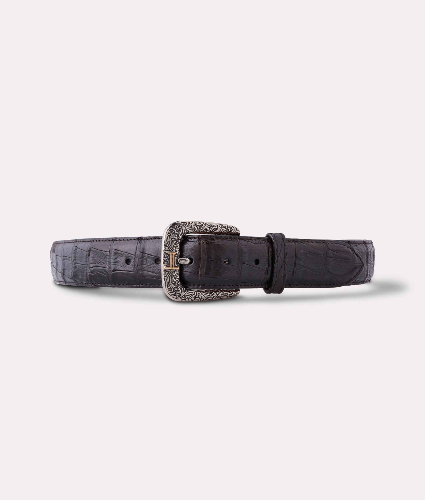 Lucchese’s exotic belt made with caiman crocodile. The belt’s ultra belly caiman leather not only provides sleek style. but also ensures durability for long lasting use. Adorned with a detailed silver plated buckle. this belt pays homage to the classic West. Handmade in Texas. 1.5 wide Removable buckle.