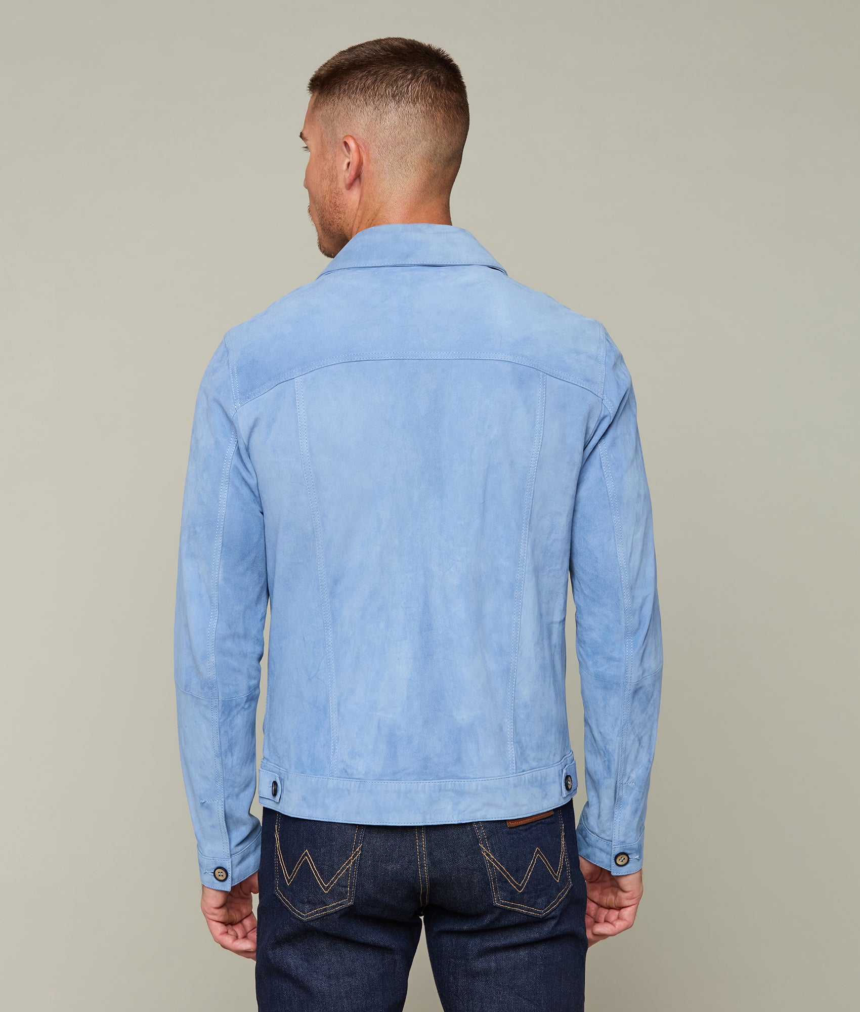 The Big Sky Jacket is a nod to the open skies of the West. Made from the most supple Goat Suede in muted tones of blue. this piece exudes modern flair with a touch of classic Americana. Whether worn over a plaid shirt for a casual outing or layered with knitwear for a crisp morning. this jacket promises to elevate any wardrobe with its understated elegance.