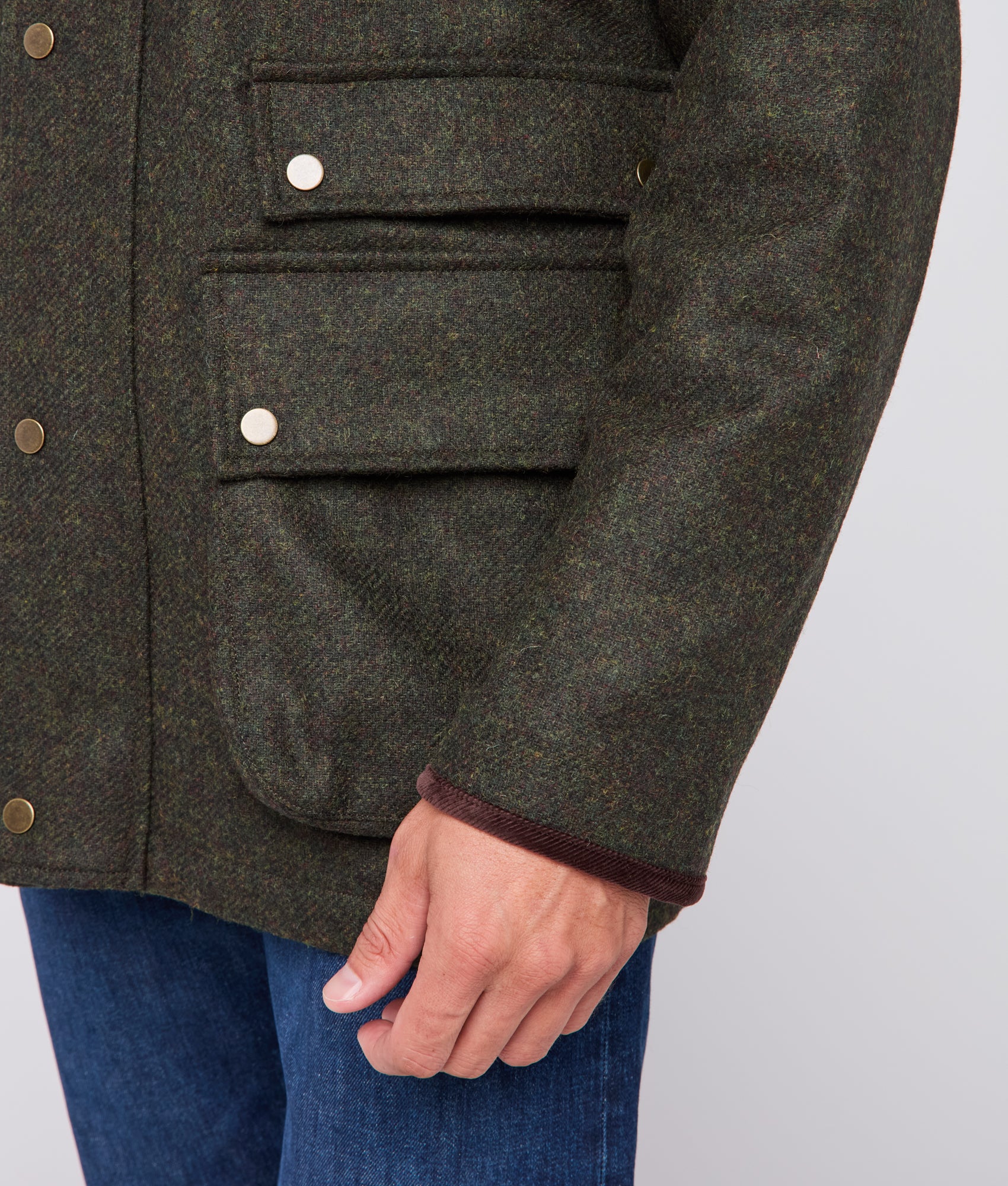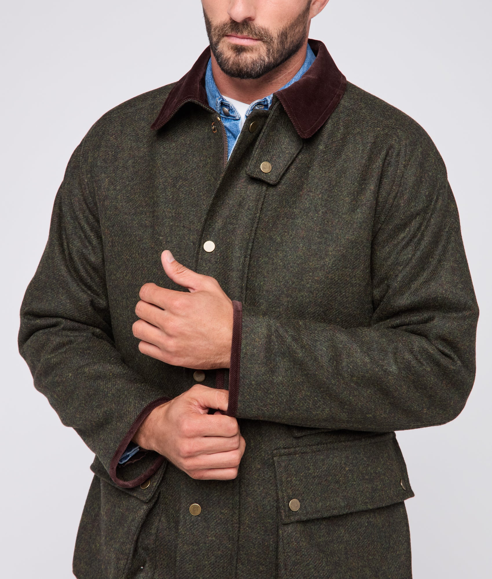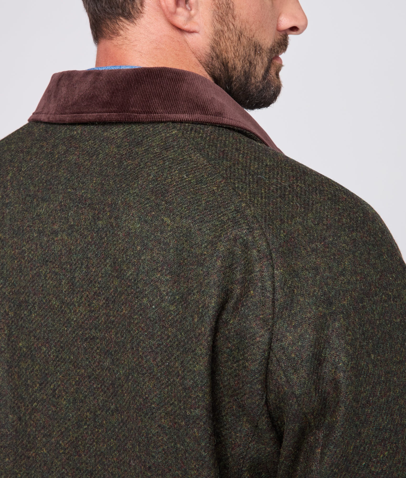 This structured. military-inspired wool jacket in a deep forest green hue features a smart. utilitarian design. Made from 100% virgin Shetland wool. this Italian-crafted jacket brings heritage craftsmanship to a contemporary outerwear staple. The rich wool texture offers natural insulation. while the clean design keeps it versatile for urban or outdoor settings. Made in Italy.