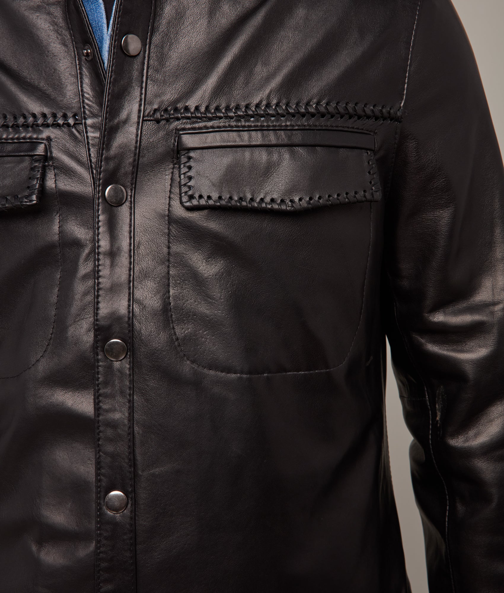 An exemplar of American leathercraft. the Clint is meticulously constructed in the USA from premium lamb leather. chosen for its unmatched softness and natural luster. The jacket’s silhouette is defined by precision whipstitch detailing along the chest pockets and collar. Fully lined in 100% acetate for a fluid drape. it closes with a series of polished snap fasteners. balancing function with understated form.
