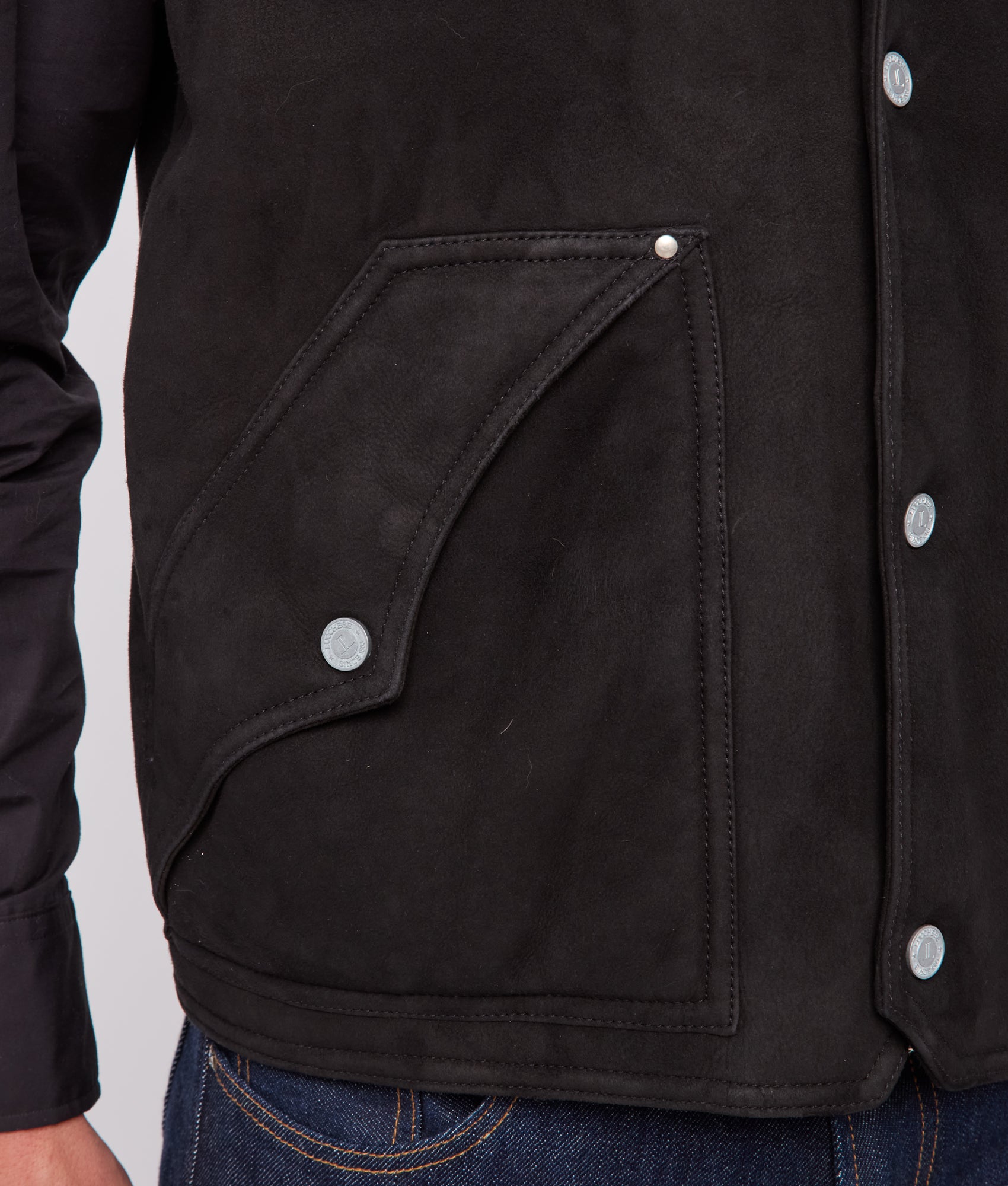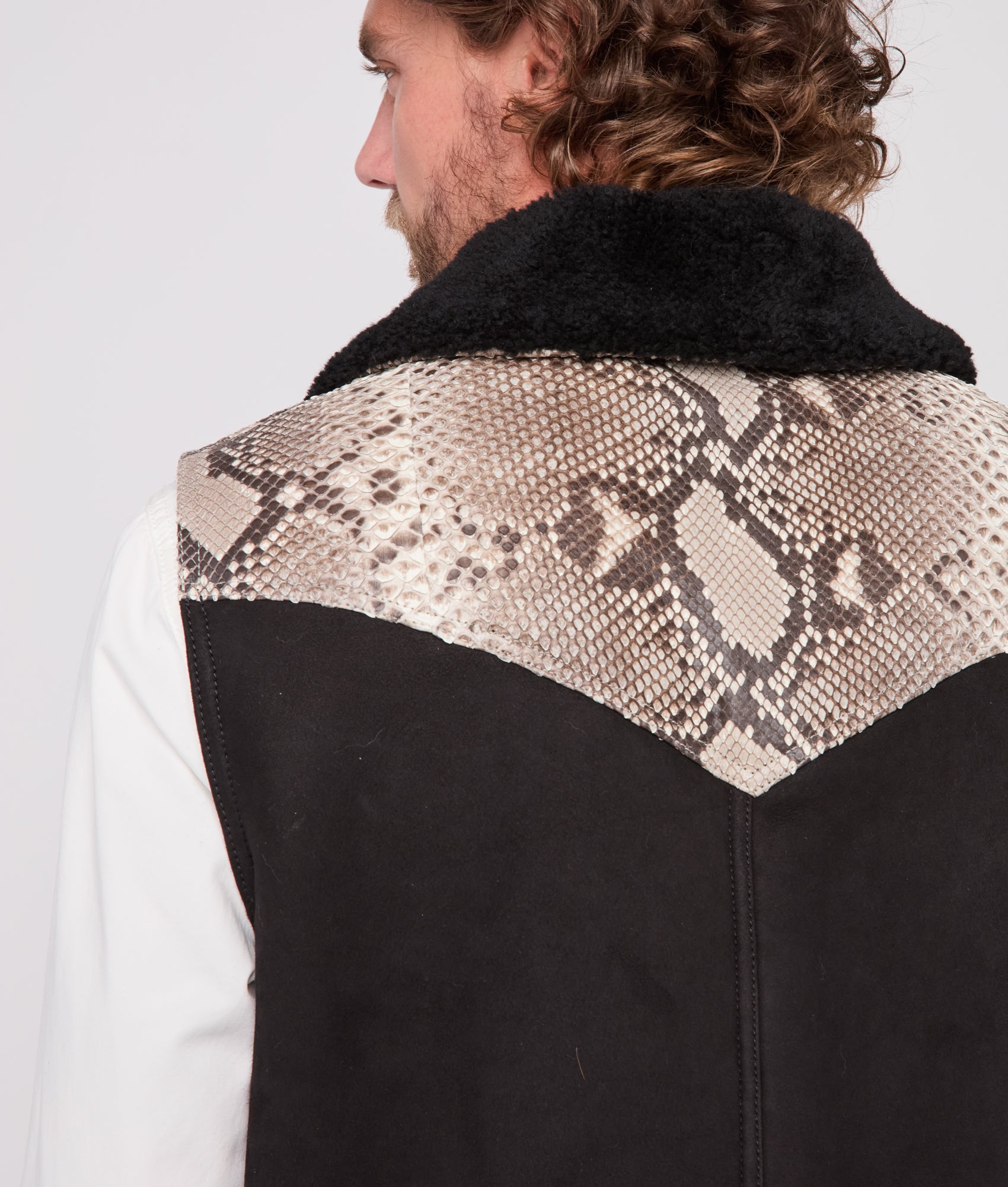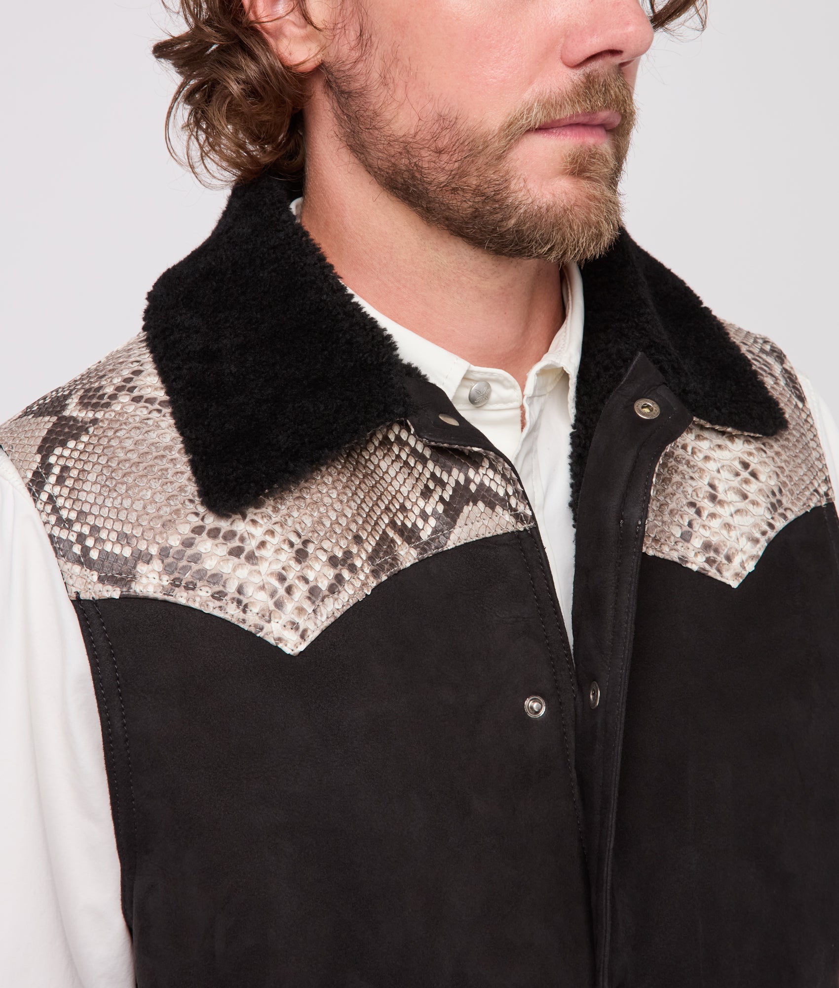 Behold the Dustin Exotic Vest. a testament to the beauty of reticulated python. Embracing our heritage through craftsmanship. the shearling collar exudes warmth and refinement. framing the neckline for those colder months. Yoked pockets grace the exterior while snap buttons punctuate the front closure.