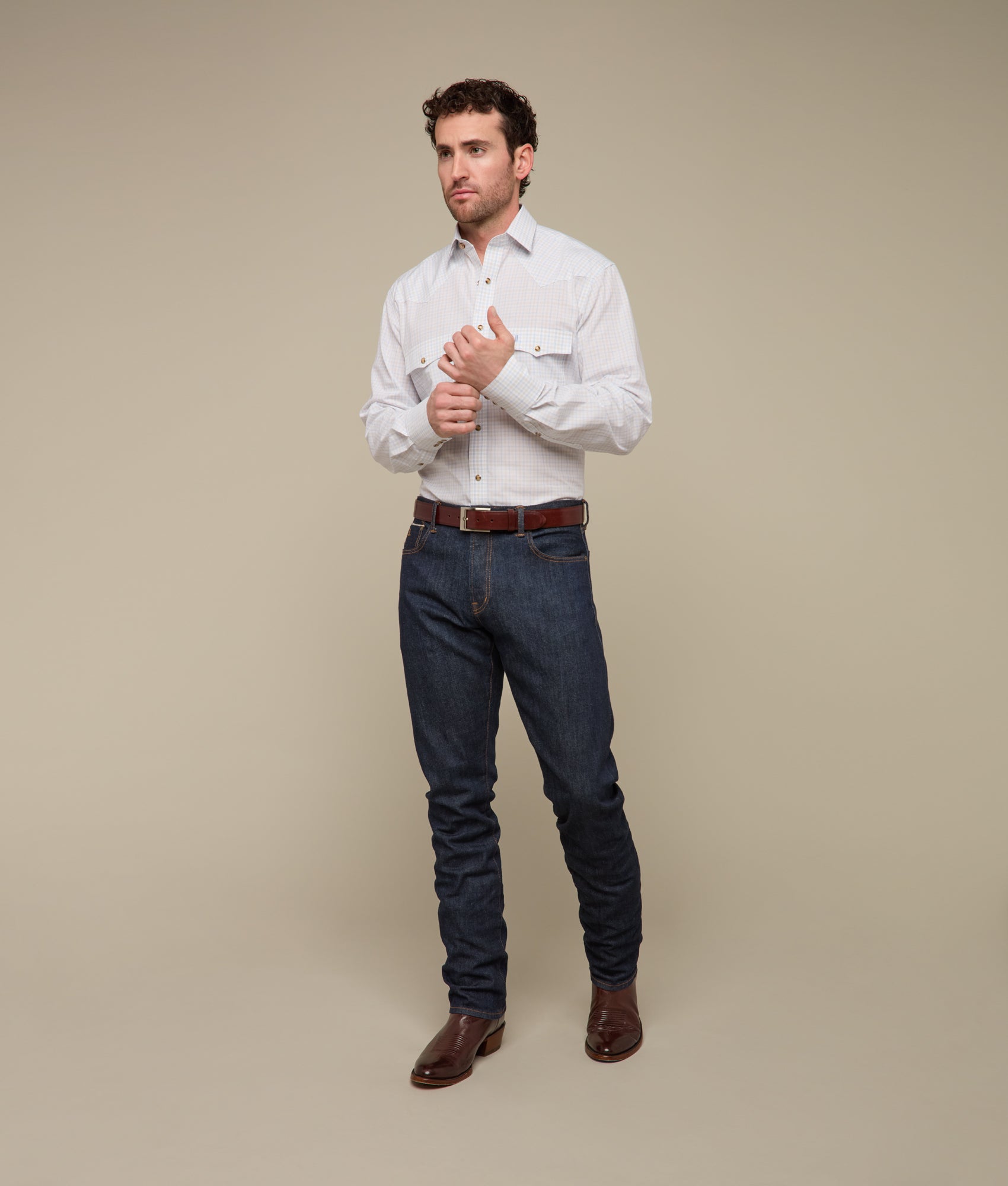 Named for our El Paso factory. this rugged. cotton western shirt features a cowboy yoke in front and back with a subtle. embroidered mirrored-L emblem on the left pocket and lower placket. Classic cowboy fit.