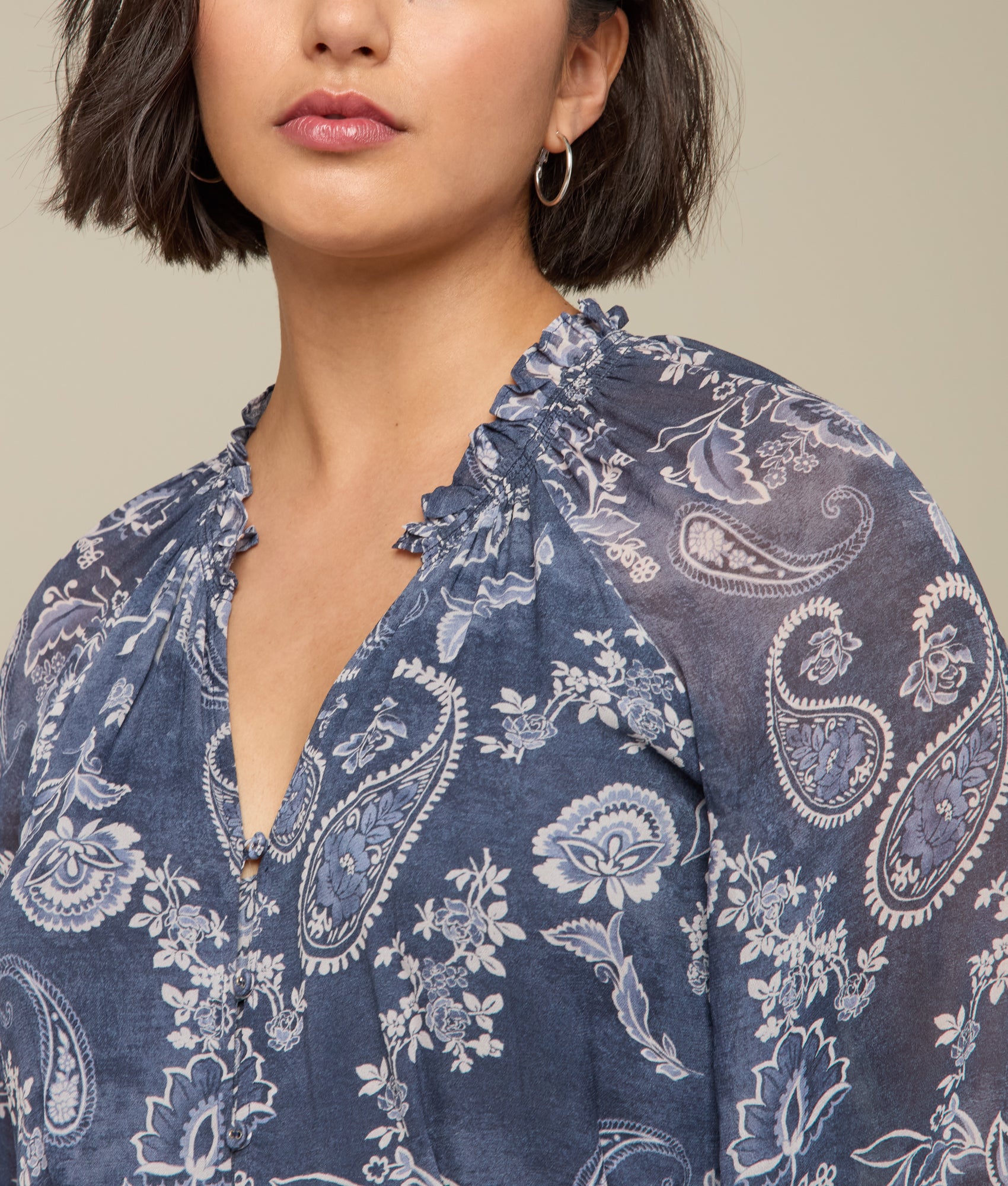 This Iris Dress features a captivating blue floral and paisley design. Its intricate patterns blend soft. romantic florals with swirling paisley motifs that evoke a sense of bohemian elegance. The lantern sleeves add a dramatic touch. creating an ethereal. flowing silhouette that moves with grace. The dress is a celebration of texture and movement. its fabric catching the light in a way that enhances the vibrancy of the design.