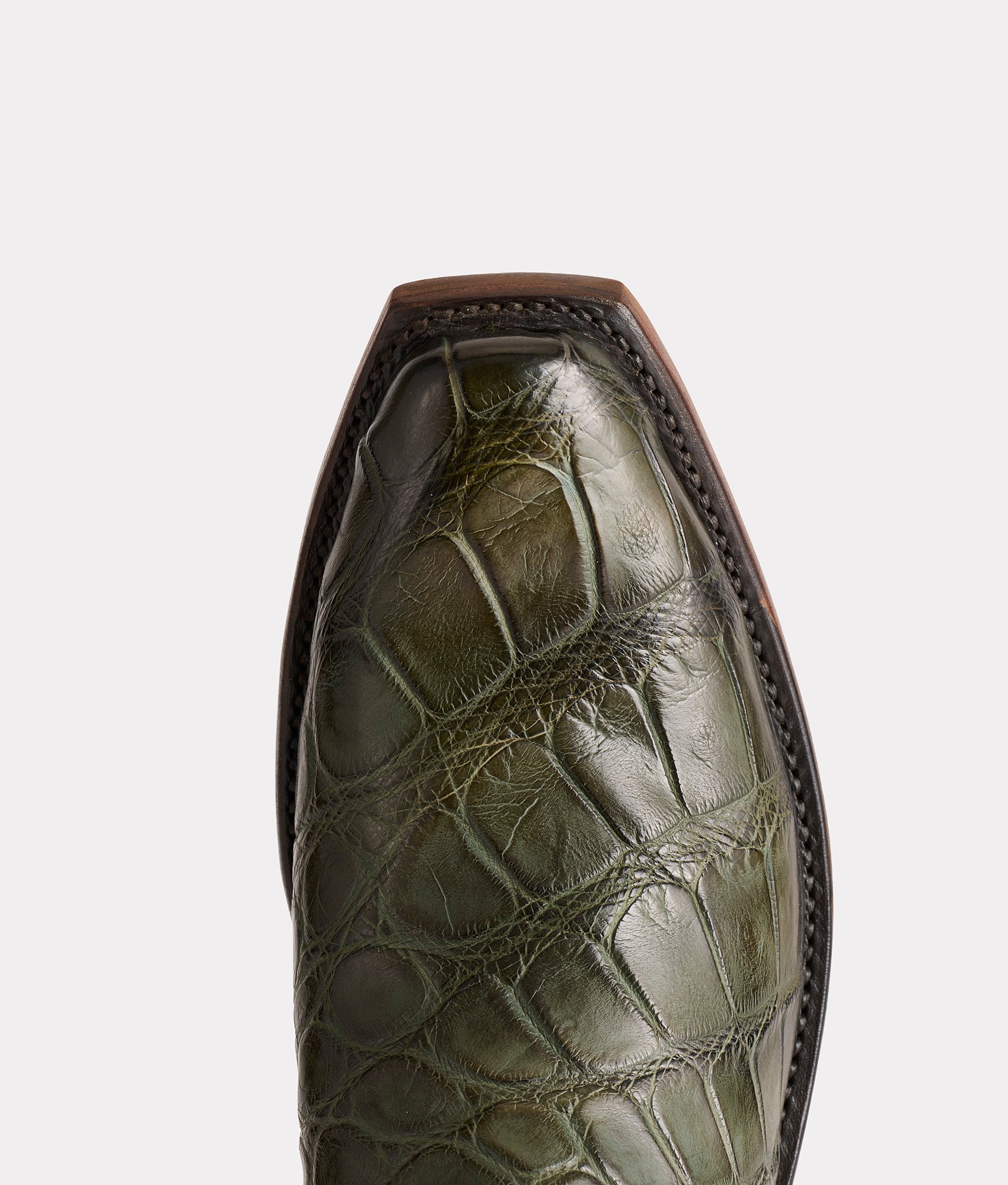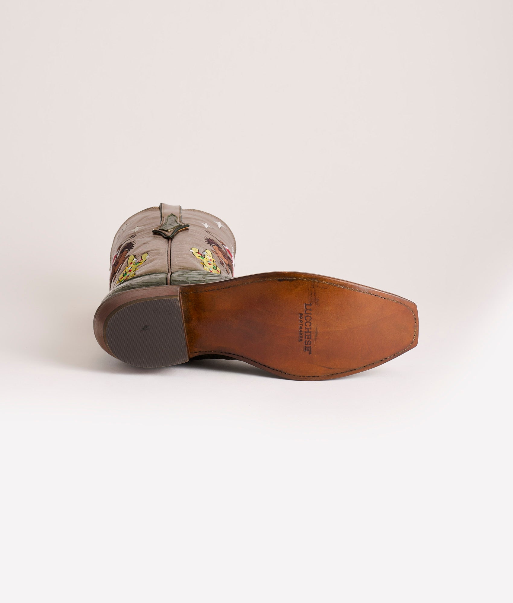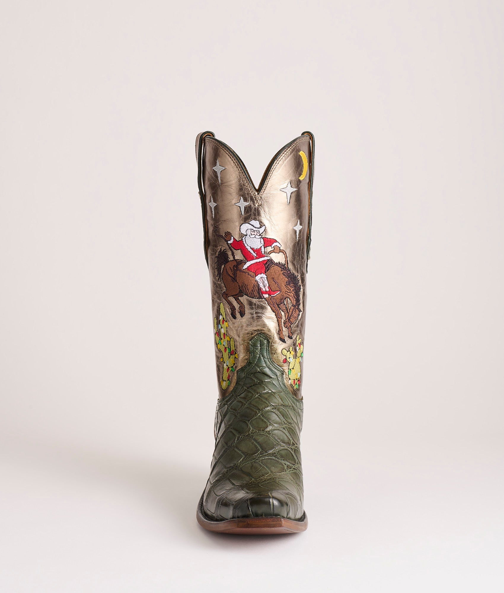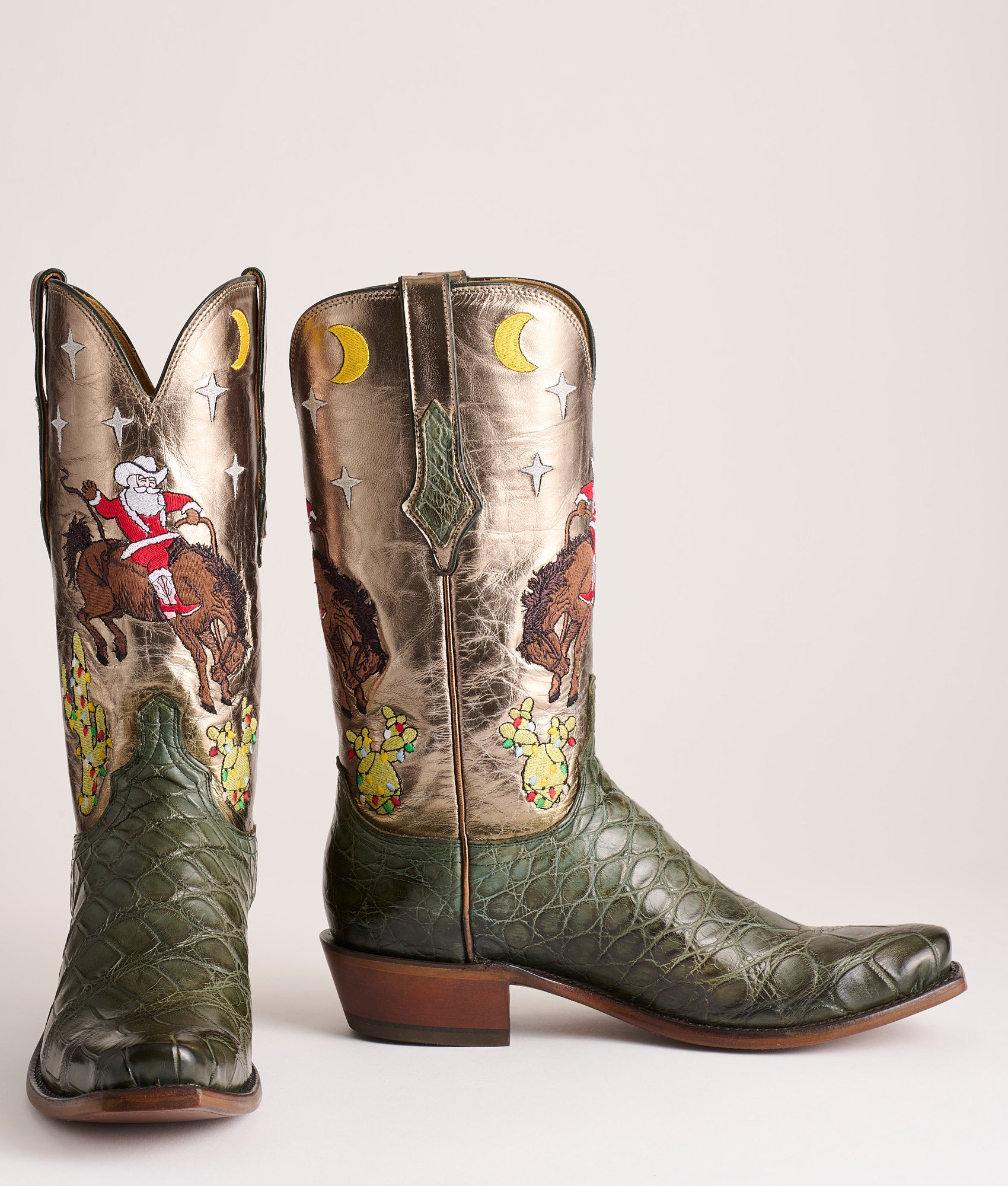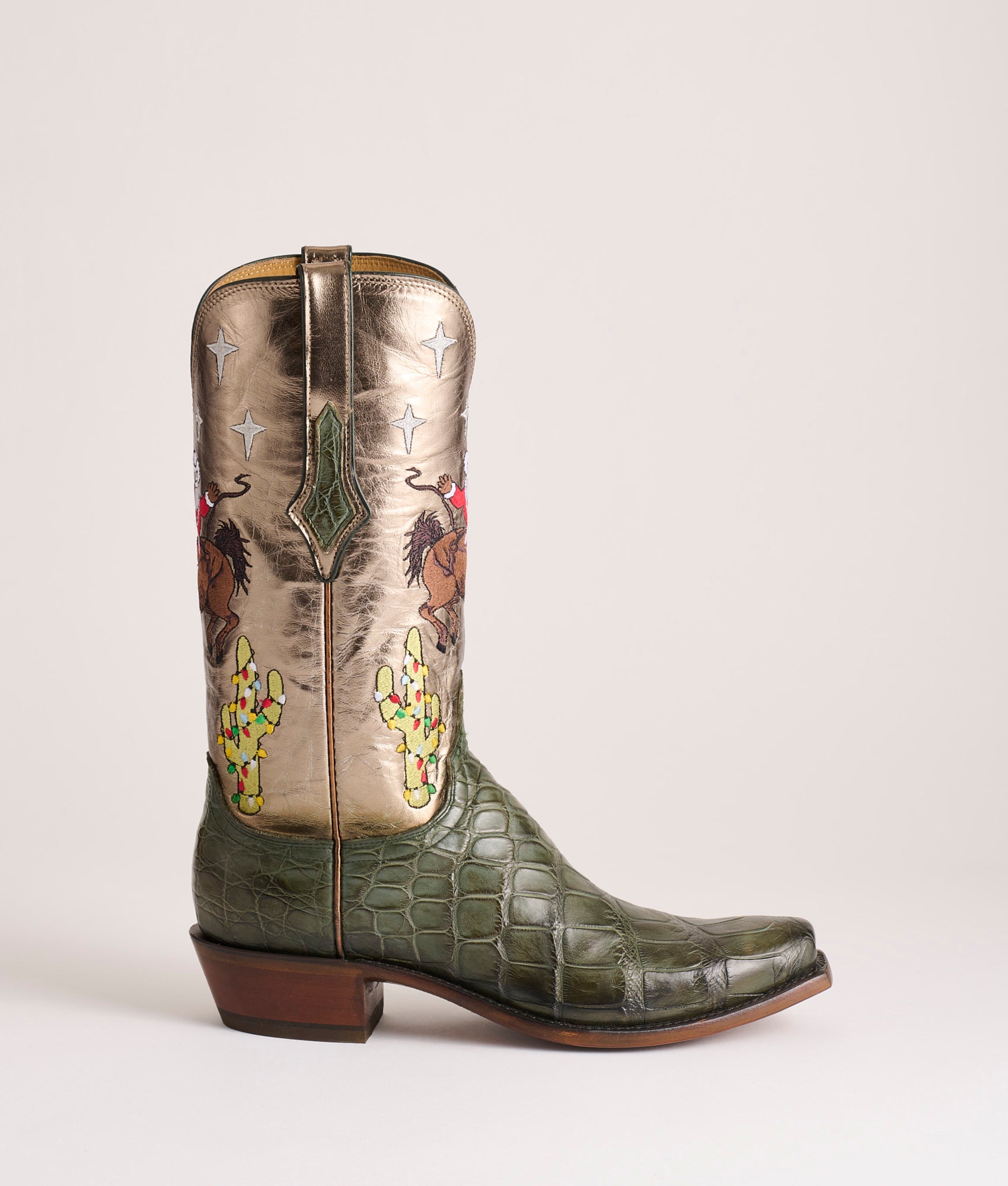 Jingle is the first edition in Lucchese’s Christmas Annual. a limited series of festive holiday boots. Hand-stained Giant Gator in a deep evergreen hue that gives the boot that heirloom feel the moment you pull it on. The vamps have been expertly finished by master Lucchese artisans. using wax and heat to reveal the high-low color of the hand-stained Giant Gator. which brings out the leather’s unique character and depth. A metallic-foiled bronze Goat shaft catches the glow of firelight. embroidered with a scene that’s only a child at heart would dream up: Santa himself spurring a bronc beneath a star-flecked sky. with Christmas cactus lighting the way. Laser-engraved: Lucchese Christmas First Edition 2025. Handmade in Texas.