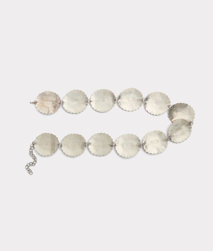 The King Concho Belt is an heirloom piece. It is hand-forged sterling silver shaped by artisans into a row of scalloped medallions. each etched with deliberate strokes and finished in a muted matte that lends visual texture and depth. At the center of every concho sits a mined Kingman turquoise stone. its desert-blue depth anchoring the belt in the southwestern landscape. Measuring 38 inches with an added 5-inch chain for adjustability. each 3 x 2.7 piece is a statement in proportion and precision.