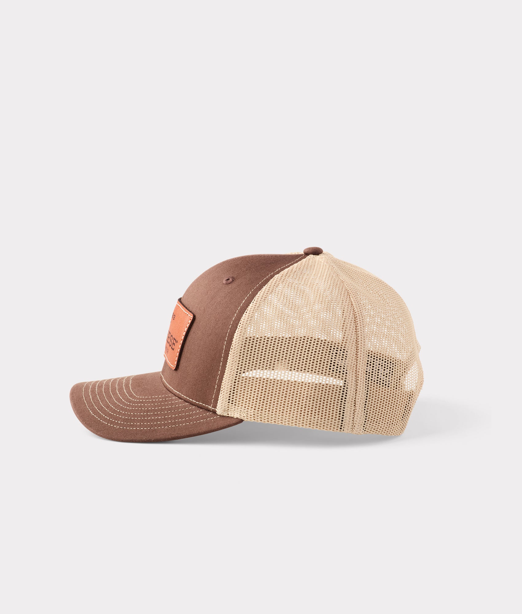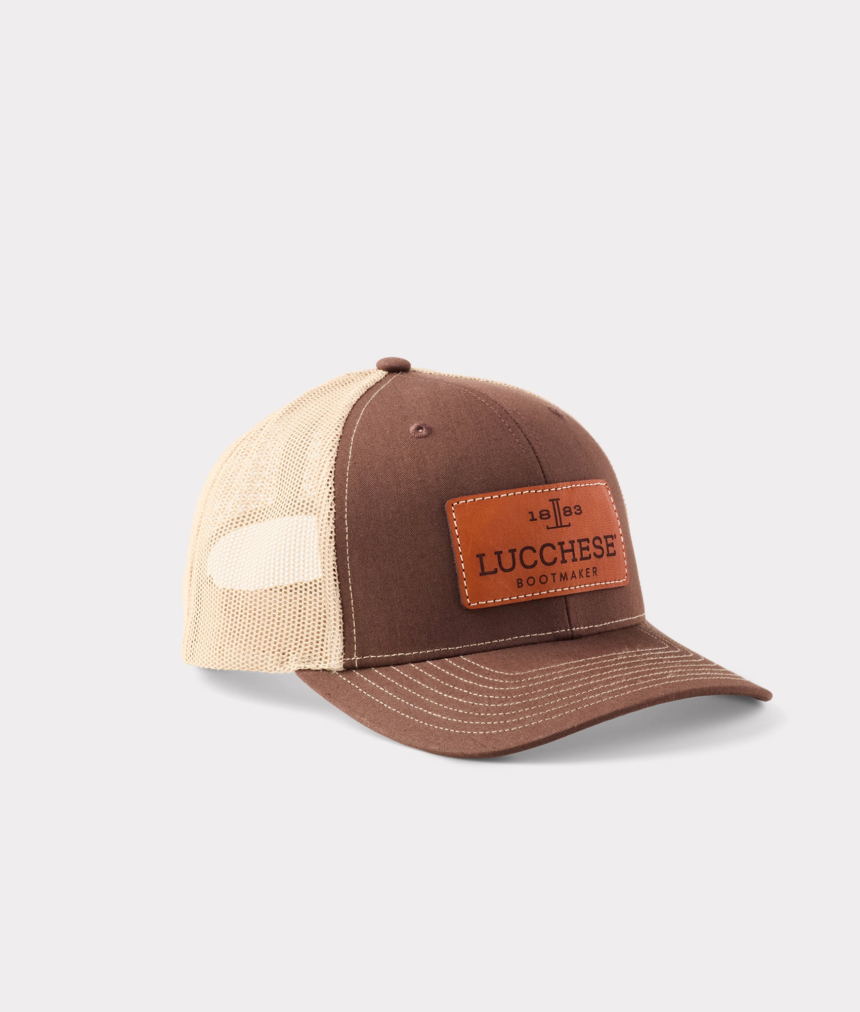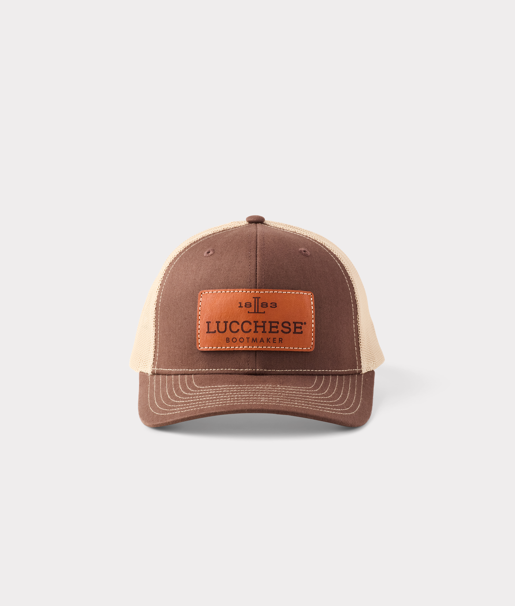 The Lucchese Leather Patch Cap has breathable mesh and an adjustable snap closure. Lucchese Bootmaker logo patch on front. One size fits most.