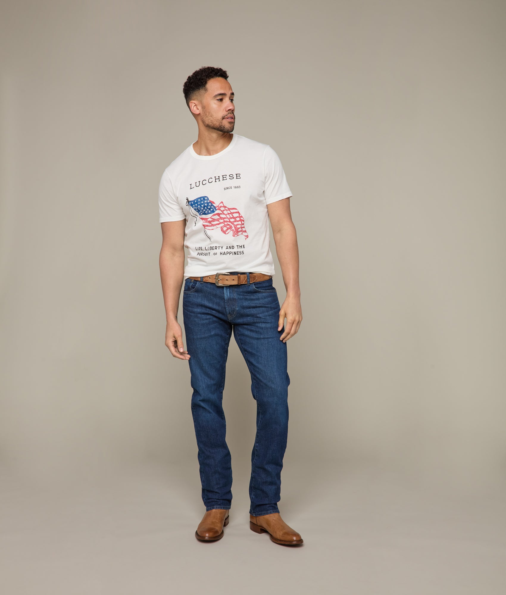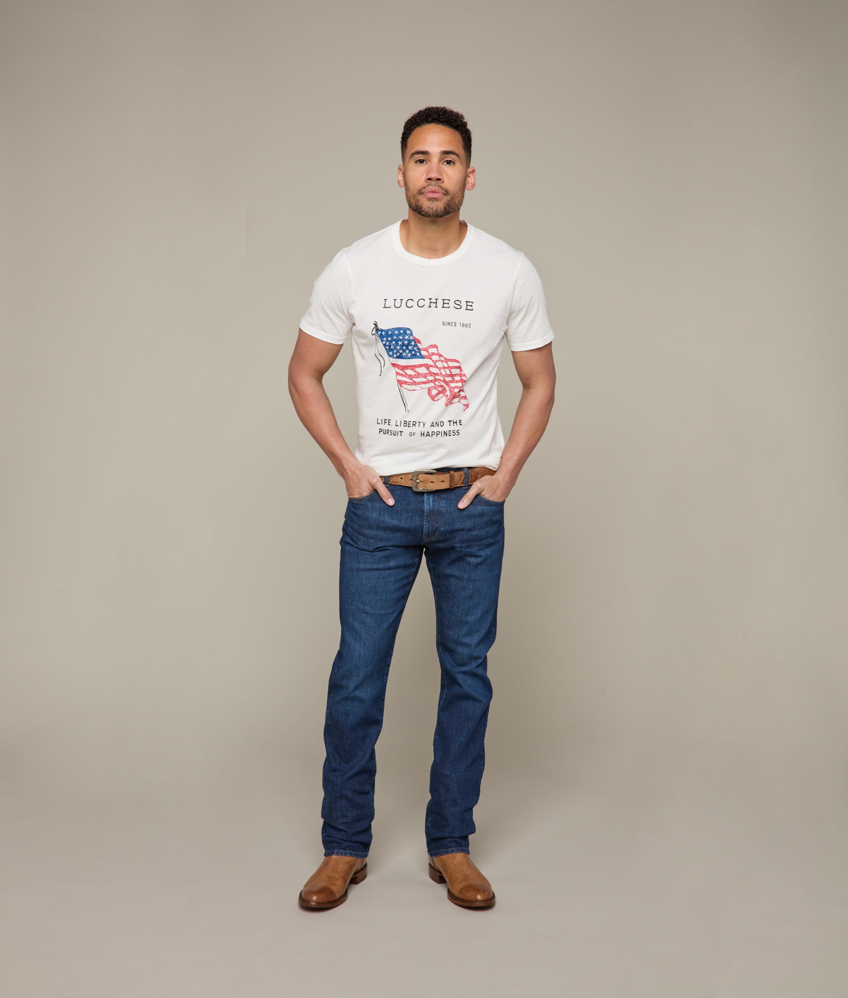 The design captures the essence of liberty in motion??a granulated American flag caught in the wind. yet full of life. Lucchese has a deep historical connection to American craftsmanship. much like the flag.