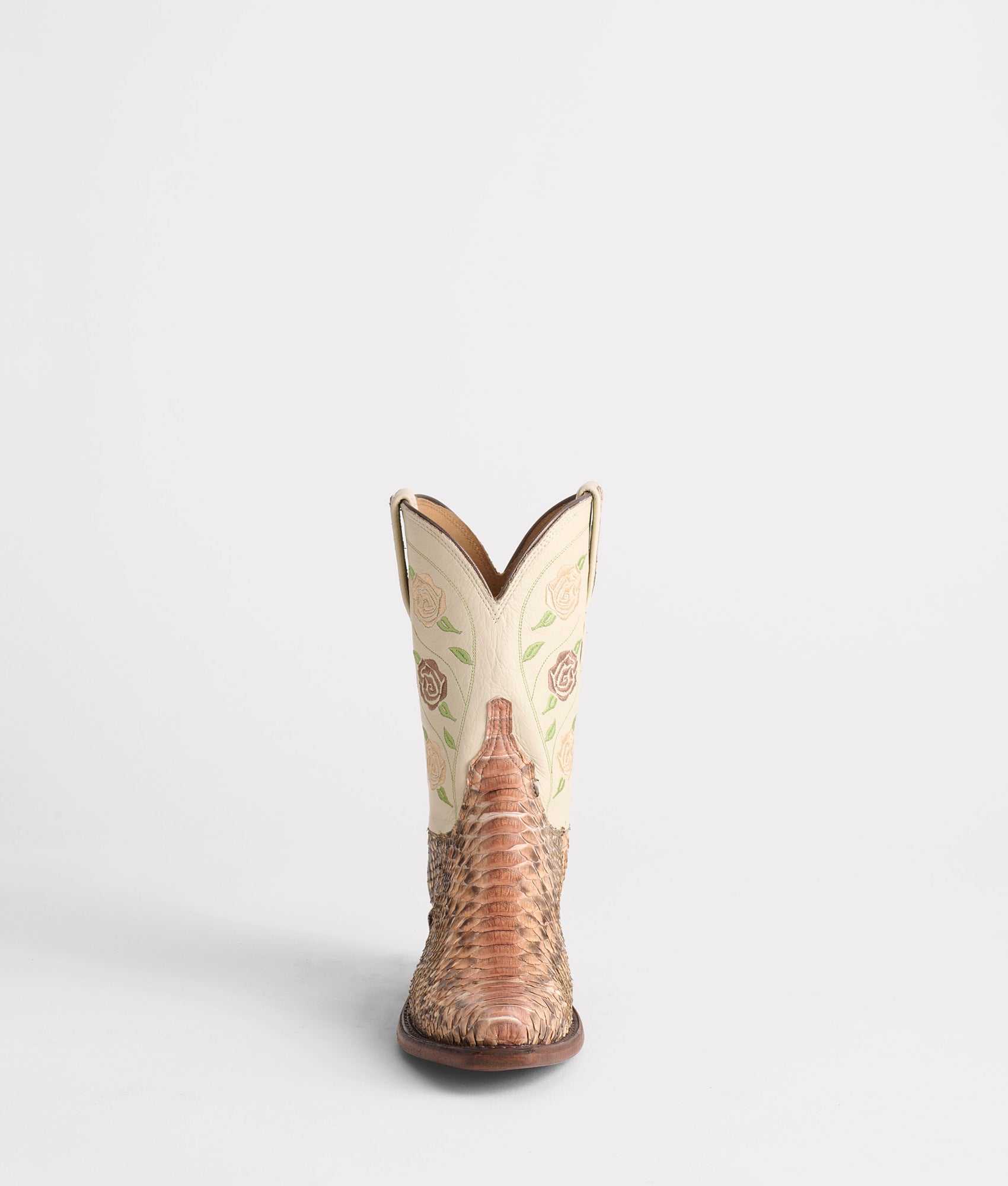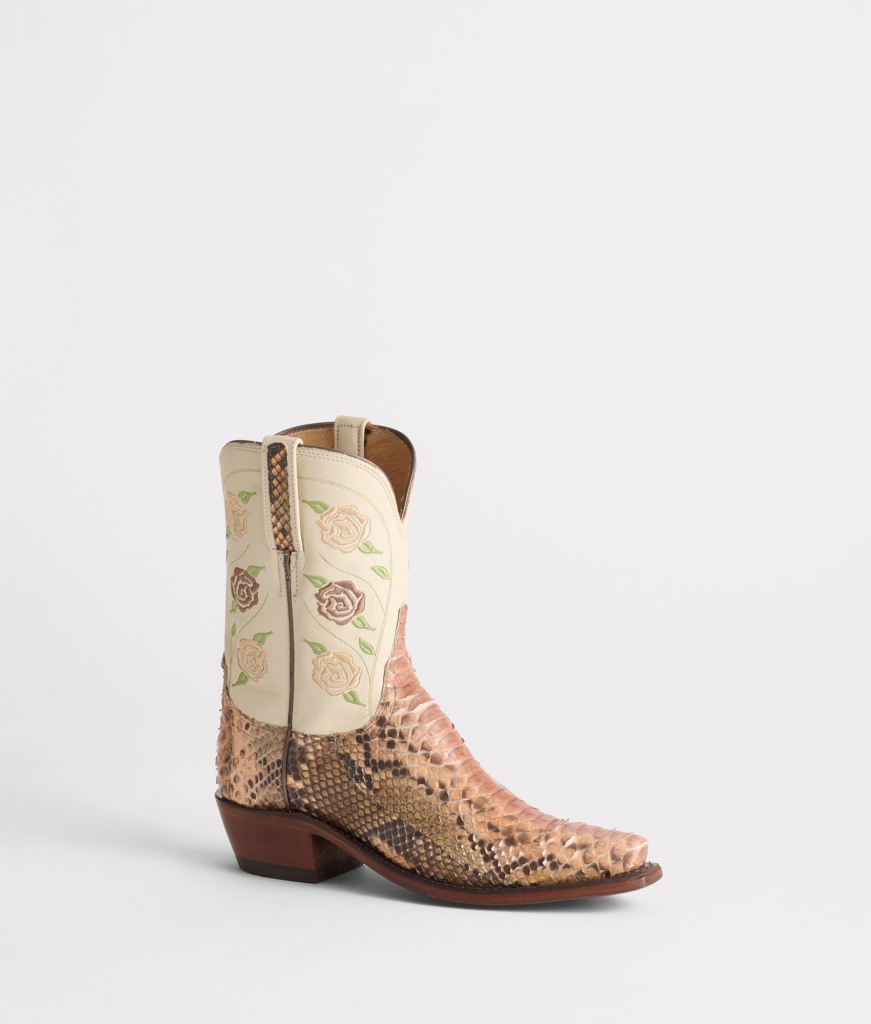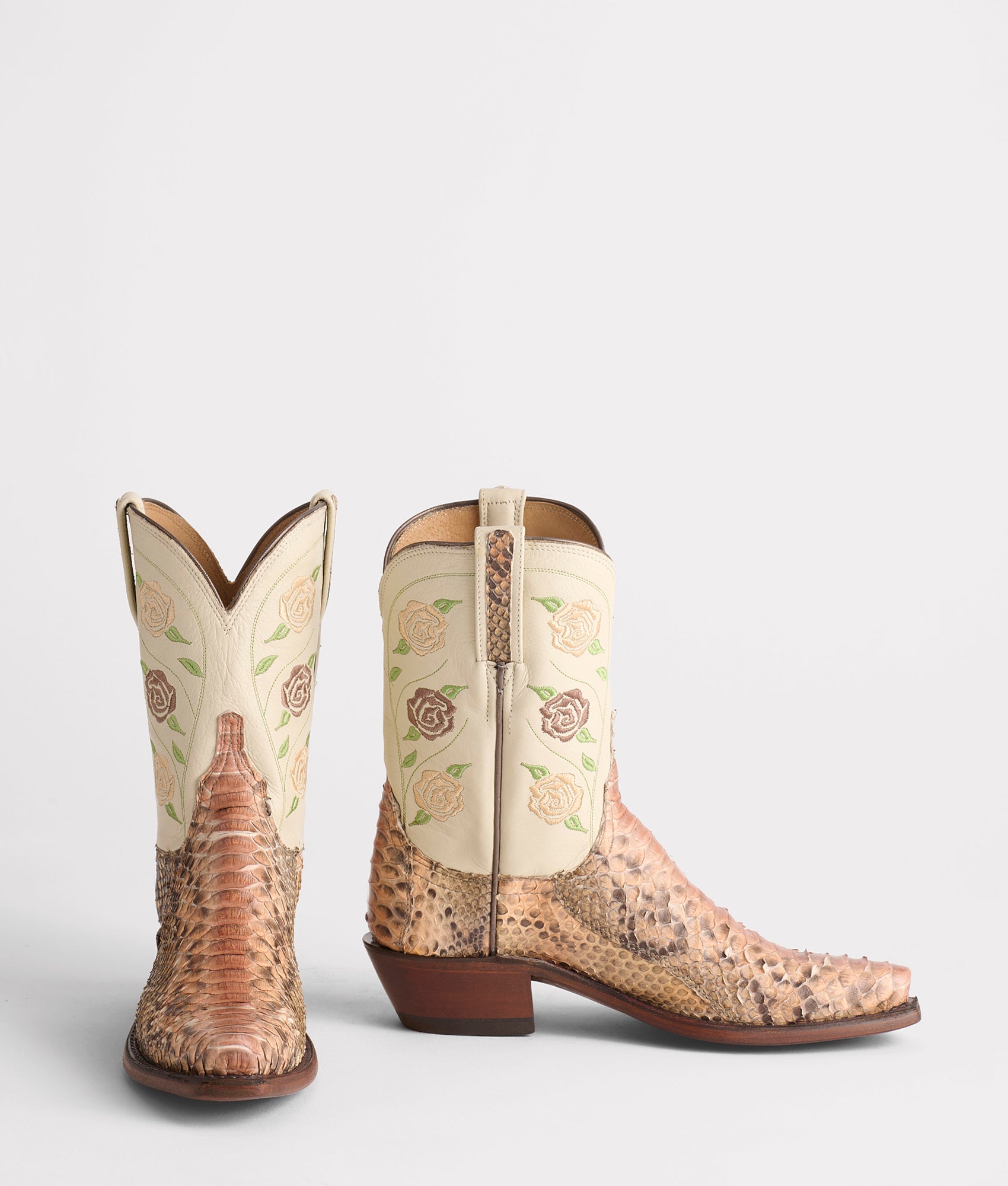 Loveless is a force of nature ?C both captivating and untamed. Though. there’s something a little unsettling when we look at her. Maybe it’s that intermingling story the vamps and quarters tell? She’s the beauty of the garden and the bite of the serpent. She’s the outlaw and the muse. the kind of woman who leaves an impression long after she’s gone. . Rising 9-inches tall. the neutral-toned Goat quarter panels serve as the canvas for the CFS Martha stitch pattern ?C a rendered string of roses built on the compressed design of our classic Seville pattern. The nude and taupe-colored roses weave a story of defiance that wink at the python vamps. Handmade in Texas.