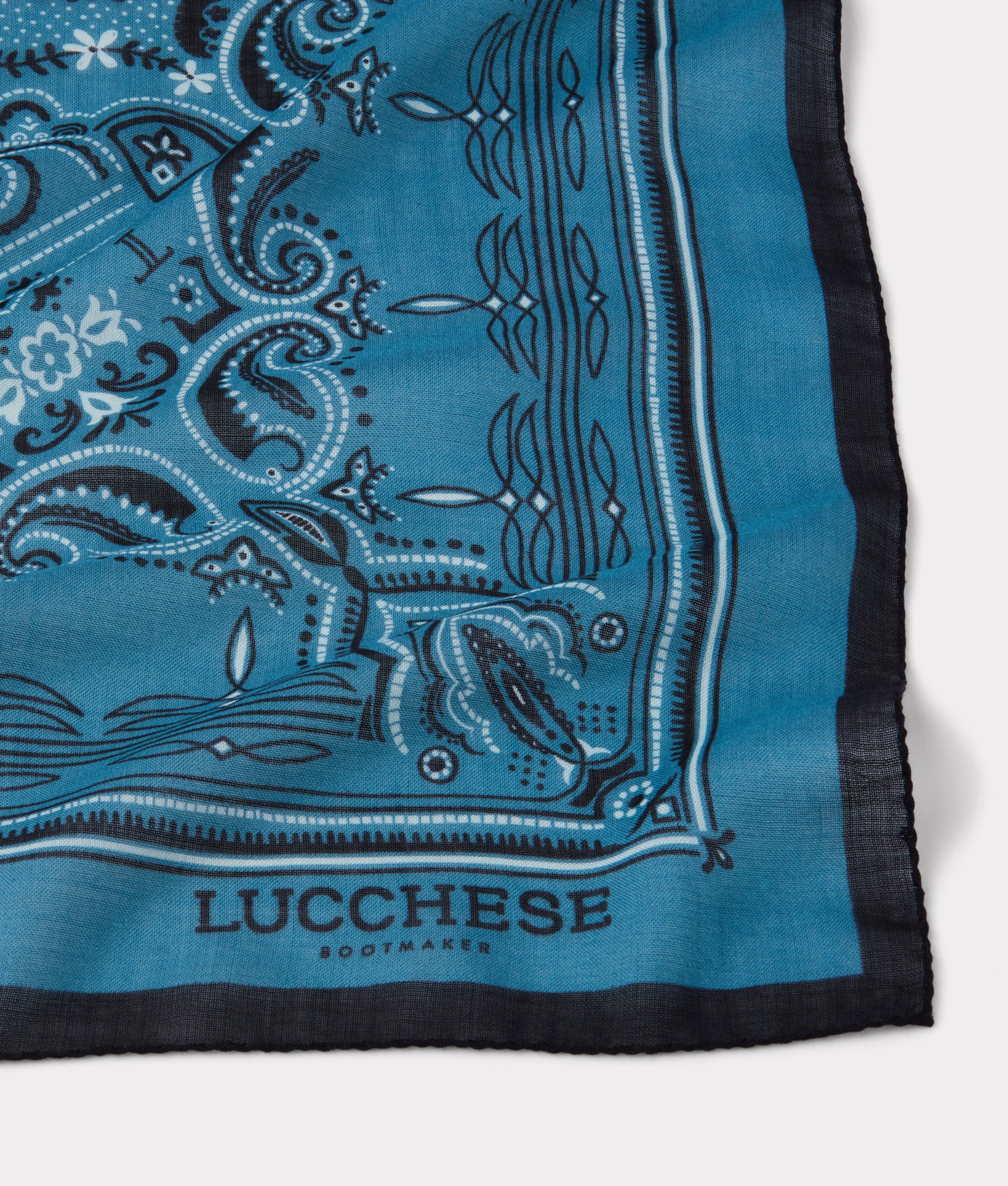 Based on our iconic Mirrored-L logo. this piece showcases subtle nods of Lucchese. Adorned with intricate. hand-drawn patterns inspired by classic western motifs. each design is a work of art. reflecting the spirit and heritage of the American West. The rich colors are carefully chosen to complement any outfit. adding a touch of opulence and style whether worn around the neck. as a headscarf. or tied to a handbag.