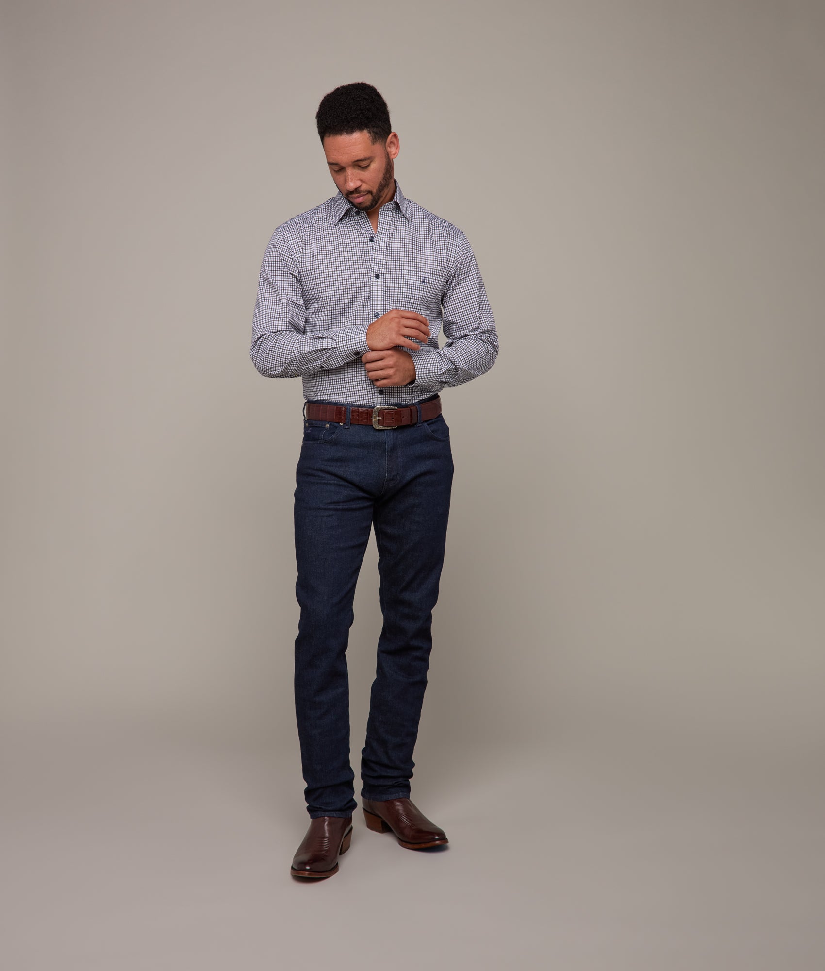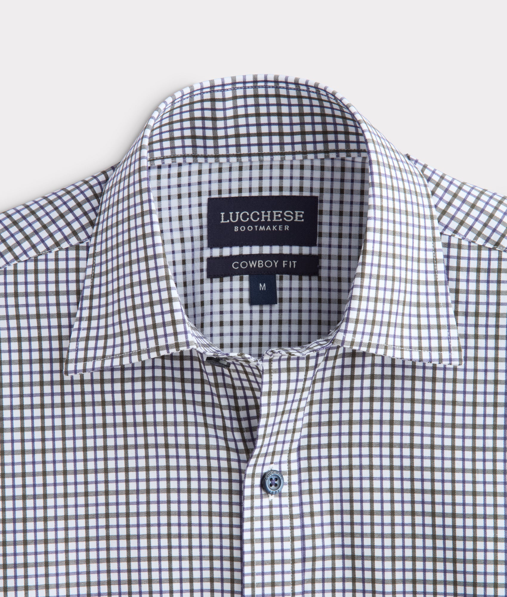Named for the Texas city where Lucchese originated. this refined cotton shirt features a hidden button-down collar. open single-patch pocket with pen slot and a cowboy yoke in back for understated Western flair. A subtle. embroidered mirrored-L emblem on the left pocket and lower placket adds interest. Classic cowboy fit.