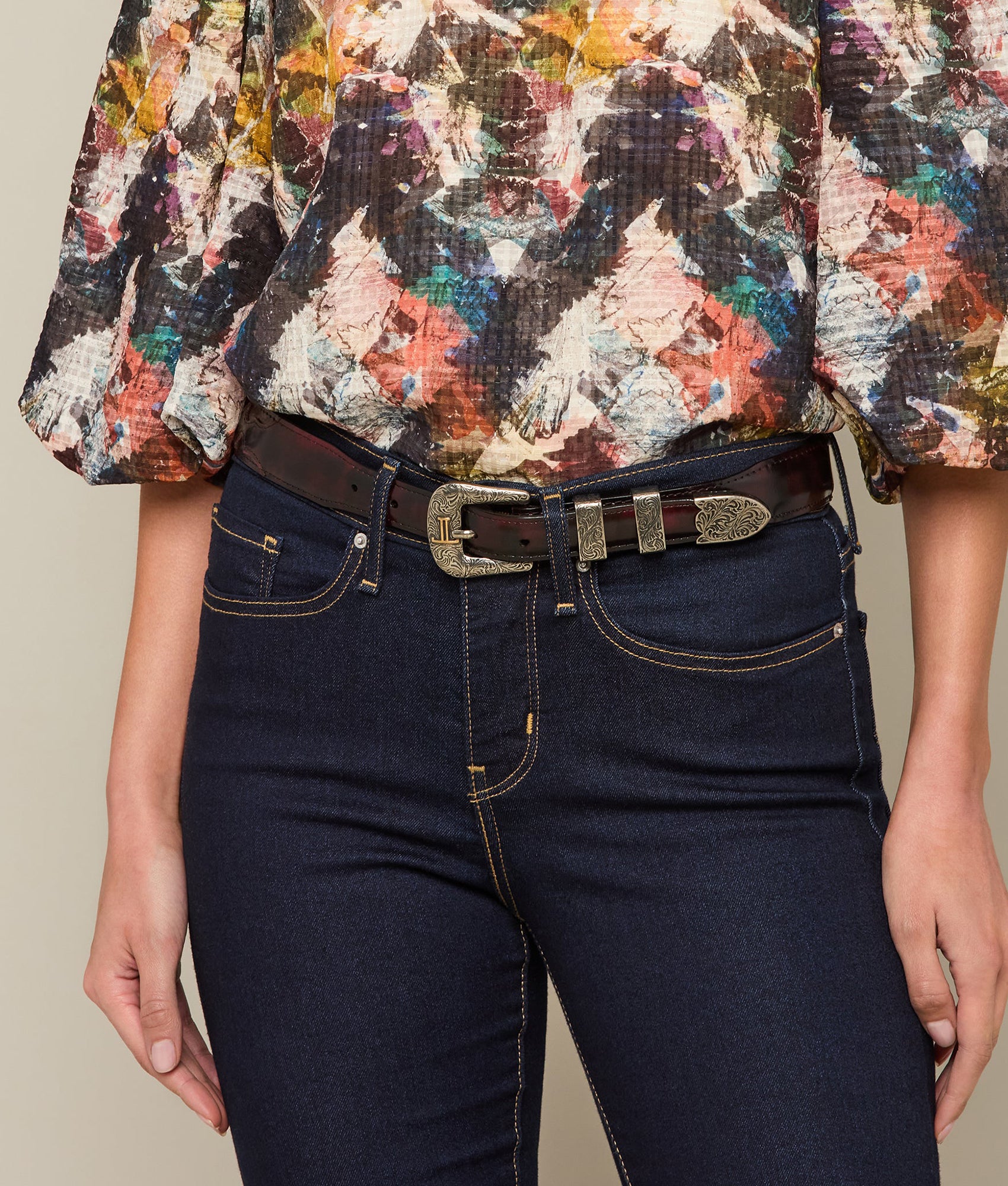 Lucchese men’s belt in black cherry goat leather. Western details are apparent in the belt’s silver plated buckle making it unique and versatile. Handmade in Texas. 1.25 tapered down to 1 Silver plated tip Removable buckle