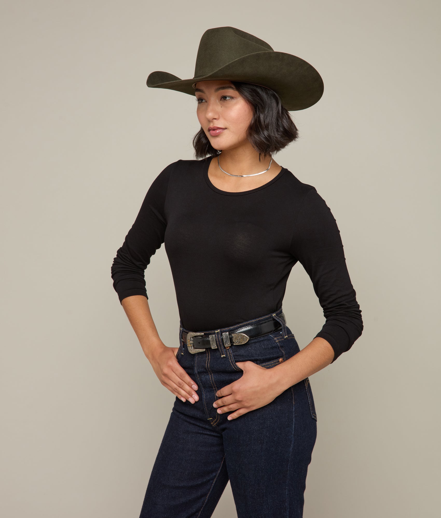 Part of our exclusive Lucchese Western hat collection. the Alamo is a hat that pays homage to the Lone Star State – inspired by the city where Lucchese Bootmaker was founded in 1883 and named after the historical landmark in Texas. The Alamo is 100% custom made and hand-shaped from a blend of the finest beaver and nutria furs. A 4 1/2 tapered crown with a slightly modified cattleman’s crease and a 4 1/4 brim achieve a Western look. A self-band made from its own body are attached with a handmade hat pin styled in the shape of the Alamo with the Lucchese mirrored-L 1883 logo inside the outline. Each hat is individually sanded to give that velvet finish. Handmade in Texas.