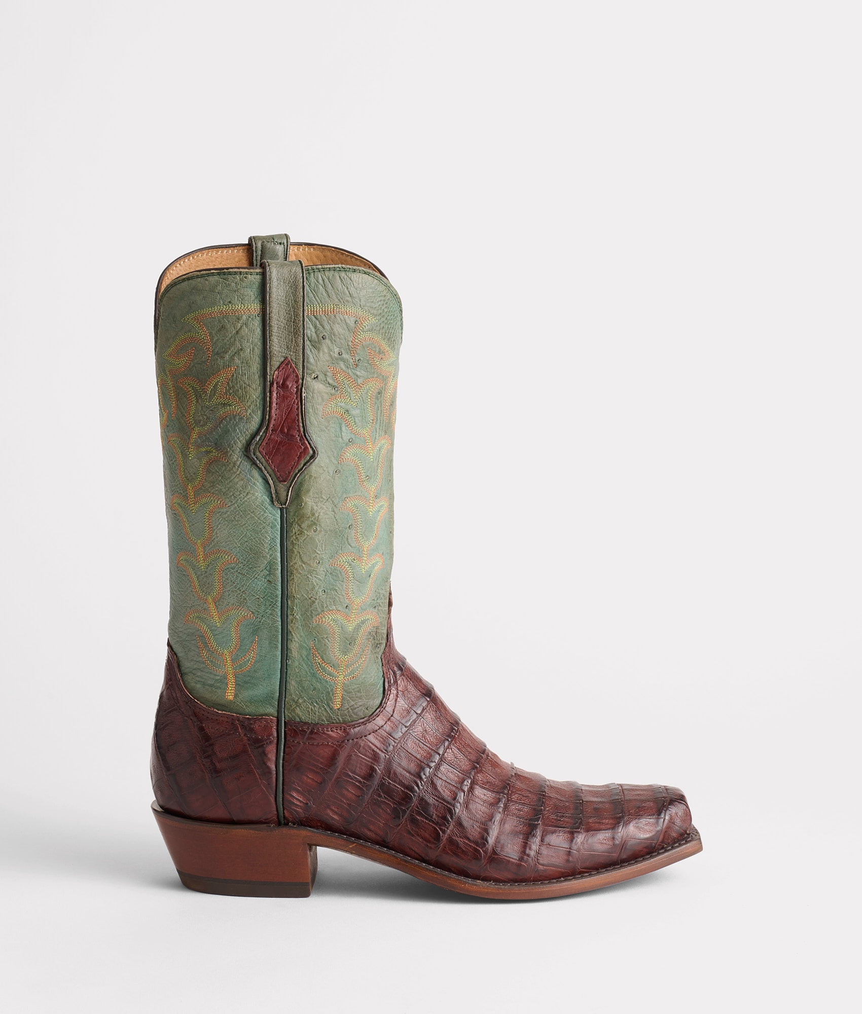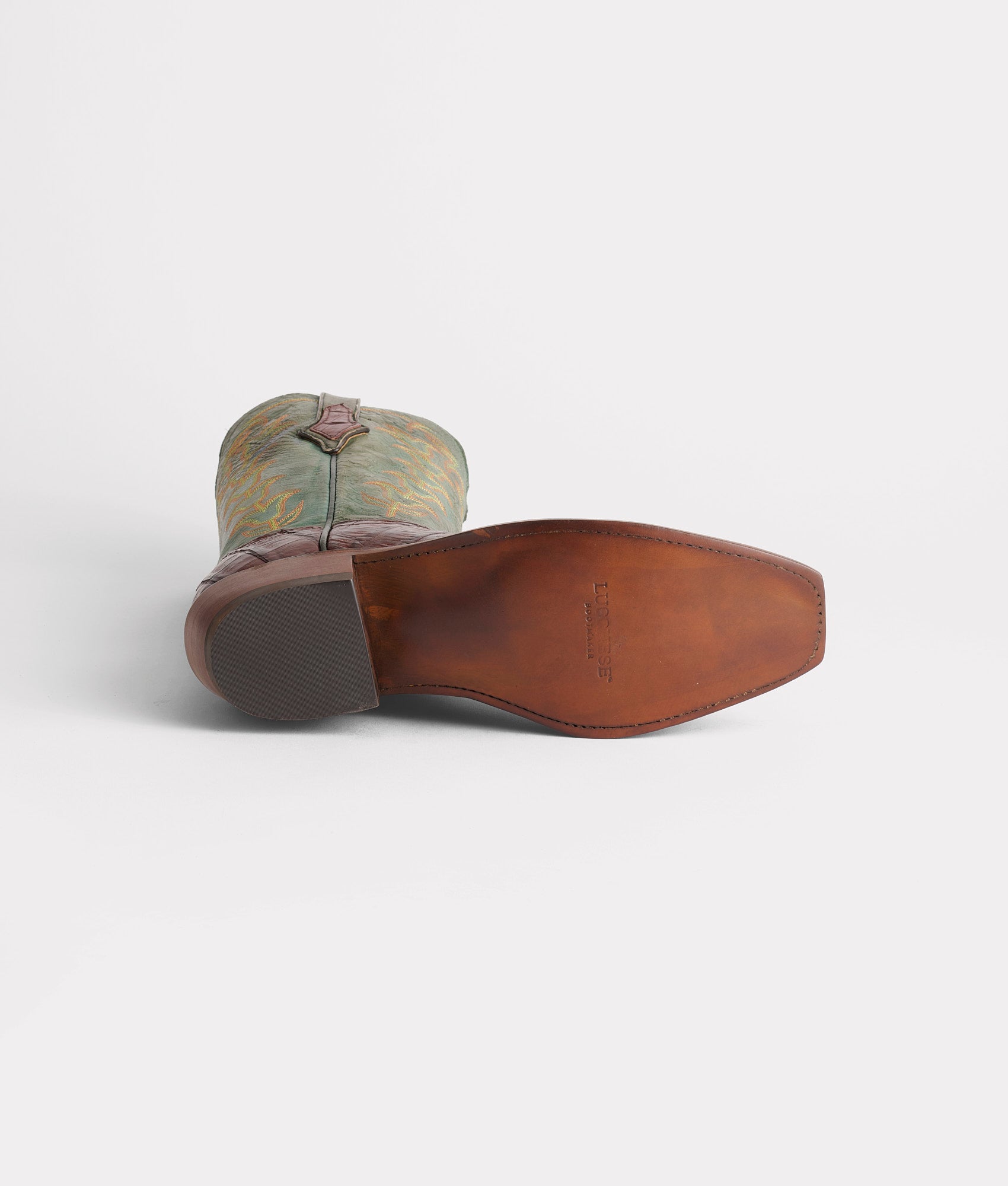 The man wearing?Tulipano?carries himself with quiet confidence. a presence that speaks before he ever says a word. He’s a man of contrasts ?C rugged yet refined. bold yet composed. Every detail of his style is intentional. and a reflection of his character. Hand-stained?Caiman in natural?brown?toneson?the?vamp?and?a?pop?of?color?on?the?Smooth?Ostrich quarters.?Why dirty a vase when you can freshen up a suit? Plus. leather smells better than tulips anyway! Handmade in Texas.